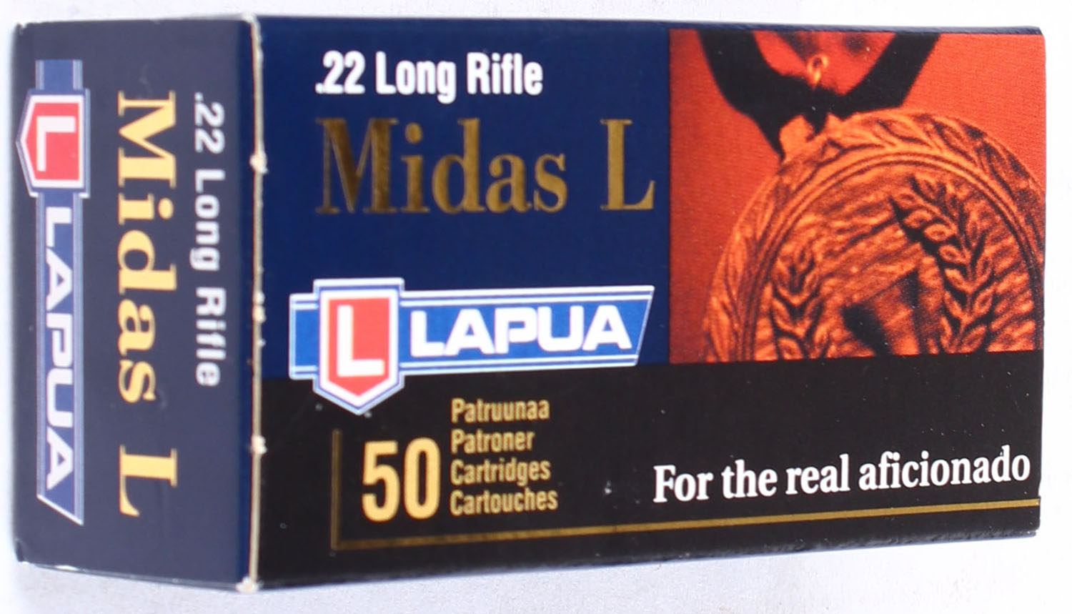 Lapua, Midas L, .22 Long Rifle, Not in RHWeb, Full, 1pc. Multi-colored box, box is MINT with minty color, corners are sharp, edges are crisp, end flaps are solid, ammo is excellent to minty. Grade: MINT - Value: 16 to 24