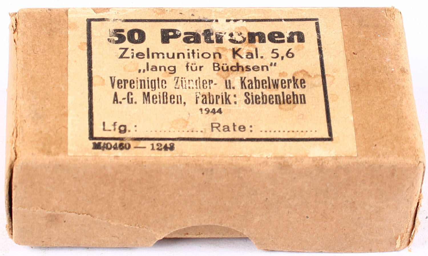 Verinigte Zunder, German Wartime Issue, .22 Long Rifle, Dated 1944, (brass cases), Full, 1pc. Buff box with white & black label, box is solid with good to very good color, some age soiling & staining, some corner wear, minor edge wear, cover flap is solid, ammo is excellent. Grade: Very Good ++ - Value: 10 to 50
