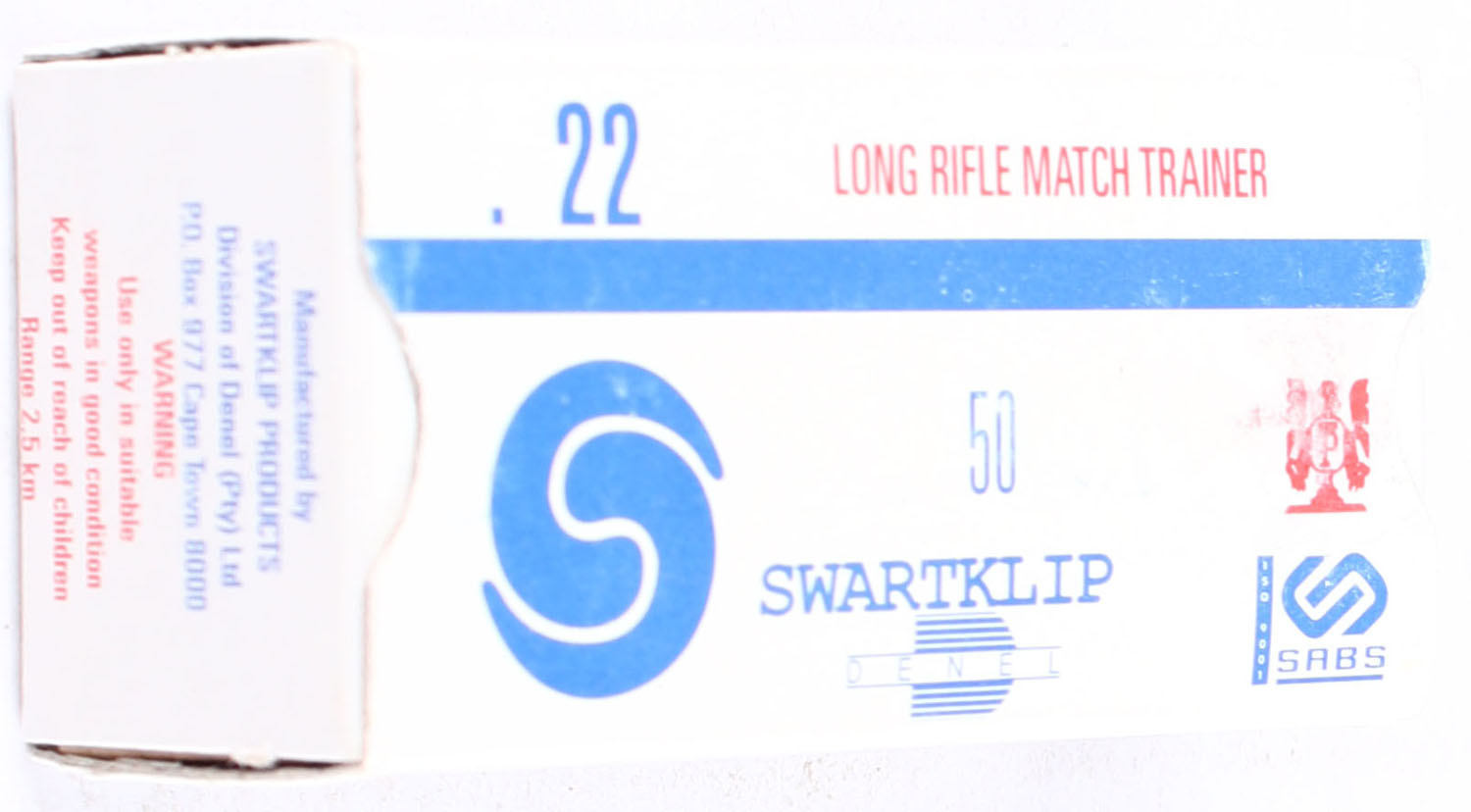 Swartklip, Match Trainer, .22 Long Rifle, RHWeb: (South Africa) SP-10 LR-5, Full, 1pc. White blue & red box, box is solid with excellent color, very minor shelf wear, corners are mostly sharp, edges are crisp, end flaps are solid, ammo is minty. Grade: Excellent ++ - Value: 10 to 20
