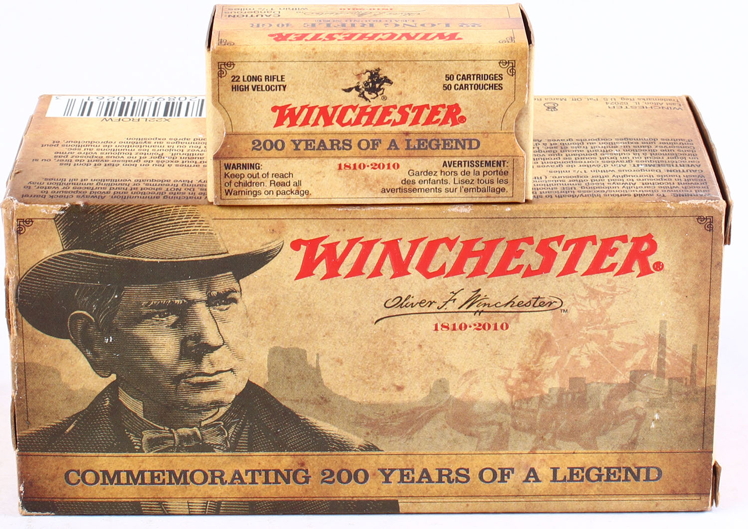 Winchester, Oliver F. Winchester 200 Year Commemorative .22 Long Rifle, 40 Grain LRN, 1pc., Full 500rds., Multi-colored brick, brick is very solid with excellent color, brick has minor edge wear to left end flap, corners are sharp, end flaps are solid, inside boxes are excellent. Grade: Excellent - Value: 100 to 300