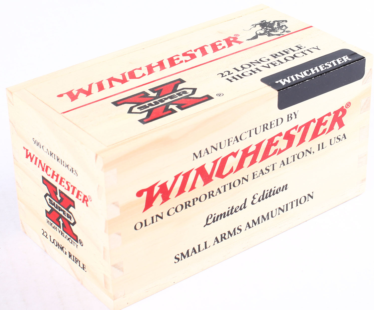 Winchester, Super X, .22 Long Rifle High Velocity, FULL & SEALED, 2pc. Wood box with red & black printing, box is MINT with minty color. Grade: MINT - Value: 50 to 100