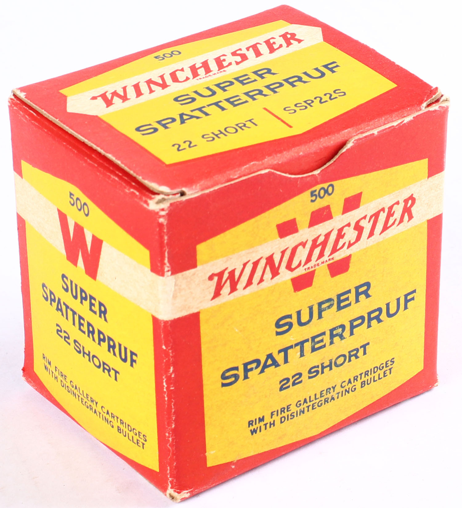 Winchester, Super Spatterpruf, .22 Short, Appears Full (500rds), Red yellow & black box, box is very solid with excellent color, has some corner wear, top flap is solid, ammo is excellent. Grade: Excellent - Value: 20 to 50