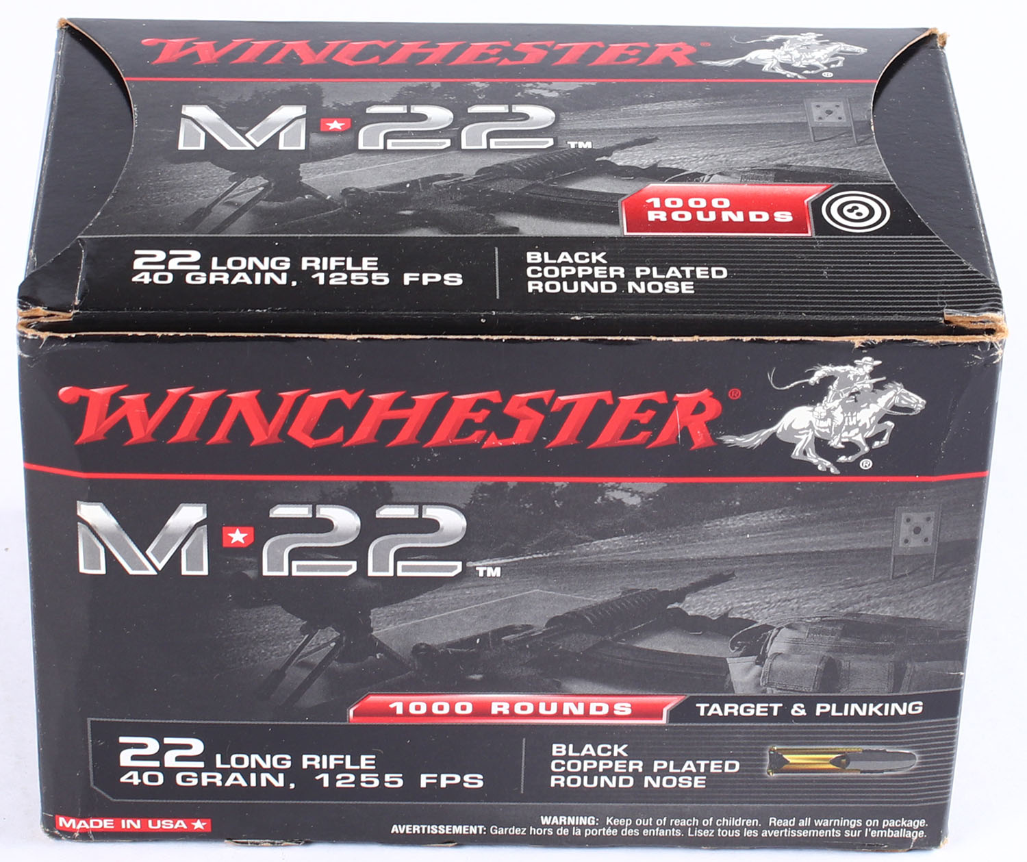 Winchester, M22, .22 Long Rifle, 40 Grain Black Copper Plated Round Nose, 1255 FPS, Full, 1000rds., 1pc. Black & red brick with (2) 500rd. Bulk boxes inside, brick is solid with minty color, minor edge & corner wear, top flap is solid, inside boxes are minty. Grade: Excellent + - Value: 60 to 120