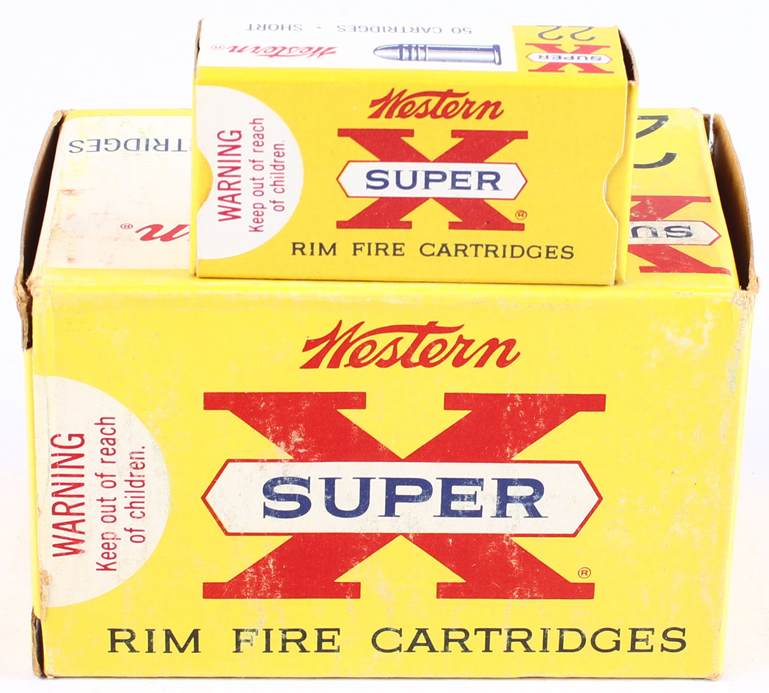 Western, Super-X, .22 Short, 29 Grain Lubaloy Coated Bullet, Full, 500rds., 1pc. Yellow white & red brick, brick is solid with very good color, minor age soiling, some color fading, corner wear, minor edge wear, end flaps are solid, inside boxes are minty. Grade: Very Good + - Value: 40 to 100