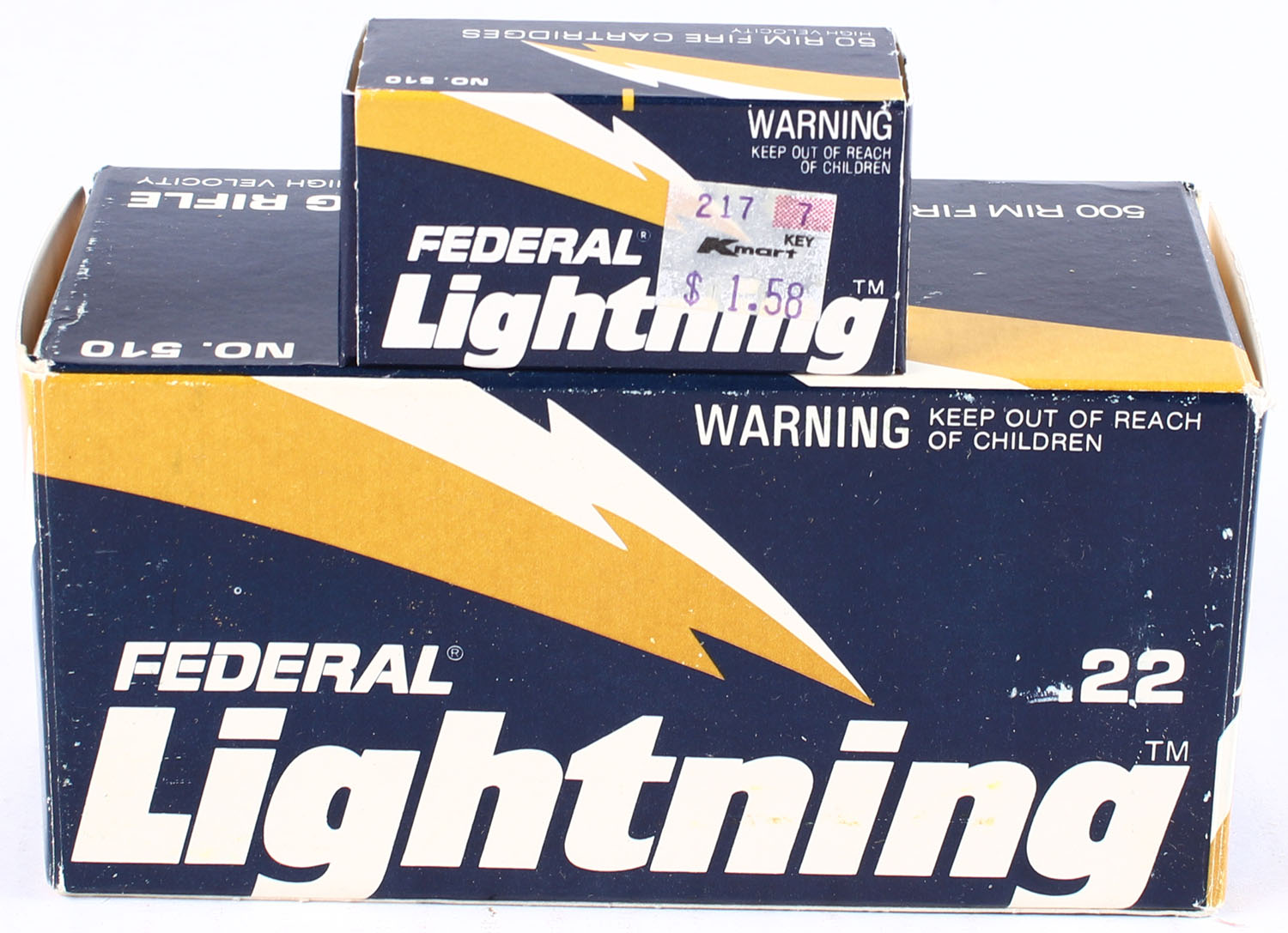 Federal, Lightning, .22 Long Rifle, Full, 500rds. 1pc. Blue white & gold brick, brick is solid with excellent color, some corner wear, edges are crisp, end flaps are solid, inside boxes are excellent. Grade: Excellent - Value: 20 to 60