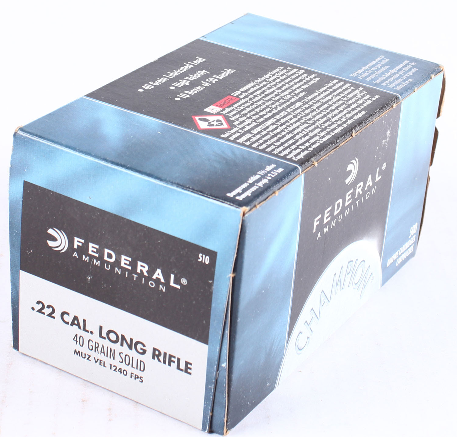 Federal, Champion, .22 Long Rifle, 40 Grain Solid, FULL & SEALED, 500rds., 1pc., Blue & black brick, brick is solid with excellent color, corners are sharp, edges are crisp. Grade: Excellent ++ - Value: 20 to 60
