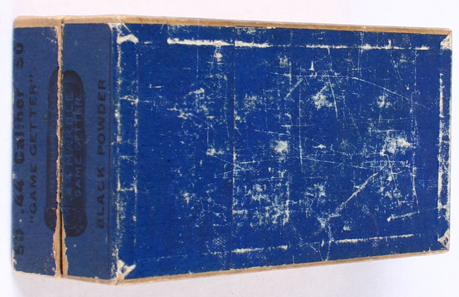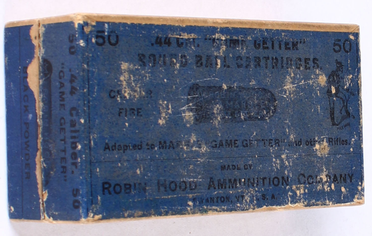 RARE ROBIN HOOD, GAME GETTER, .44 Round Ball Cartridges for Marble ''Game Getter'' Rifles, 2pc., FULL, Central Fire, buff box with blue label with black print, box is solid with 98% of labels intact, ammo is near excellent, Very Hard to Find!. Grade: Very Good ++ - Value: 1000 to 3000