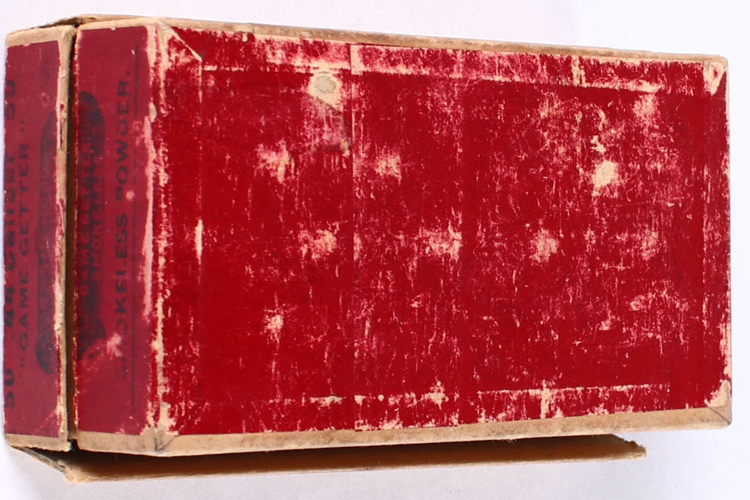 RARE ROBIN HOOD, GAME GETTER, .44 Round Ball Cartridges for Marble ''Game Getter'' Rifles, 2pc., FULL, Central Fire, buff box with red label with black print, box is solid with 96% of labels intact, ammo is near excellent, Very Hard to Find!. Grade: Very Good ++ - Value: 1000 to 3000