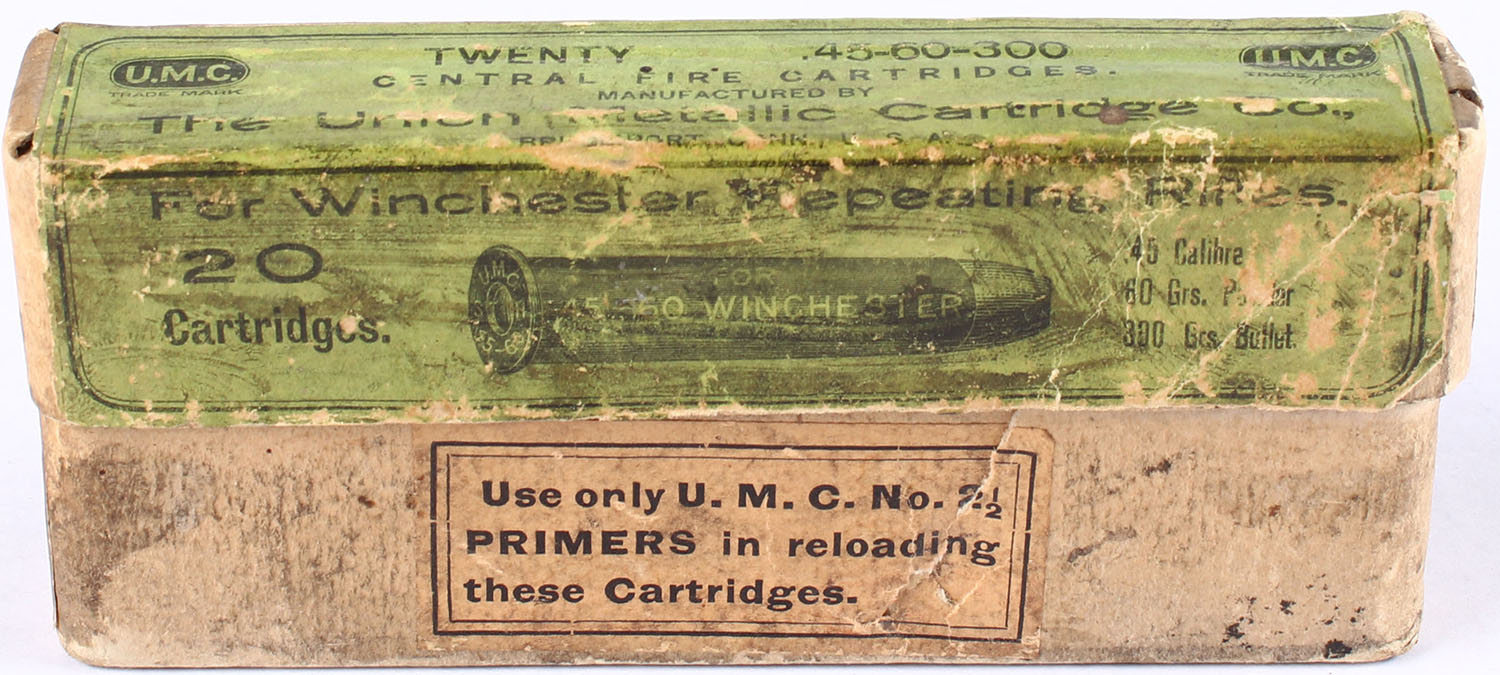 UMC, .45-60-300 Winchester, 300 Gr. Bullet, 2pc, Full, buff box with green label & black print, box is solid with light age spotting, light rub marks, & light edge wear, ammo is excellent. Grade: Very Good + - Value: 40 to 100