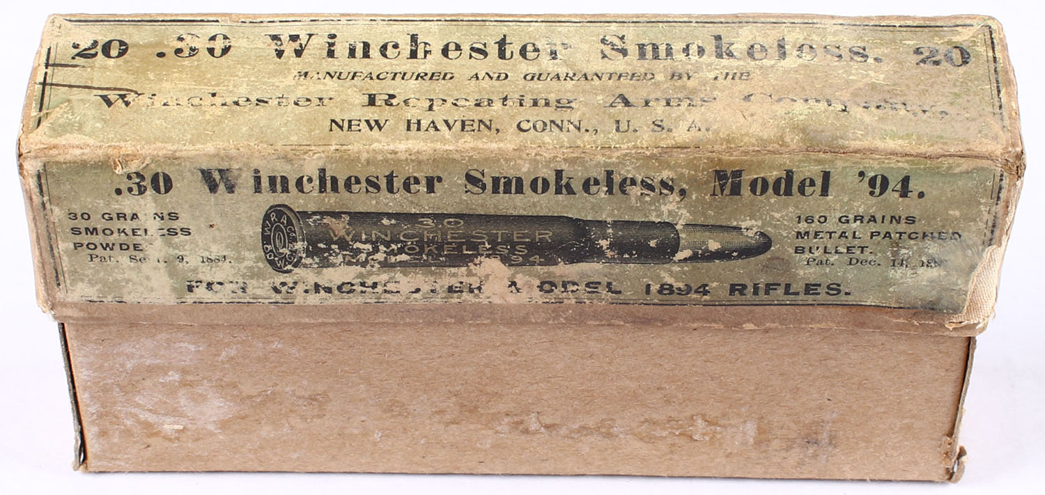 Winchester, .30 Winchester Smokeless, Model '94, 160 Grains Metal Patched Bullet, Full, 2pc. Buff box with green label, box is solid with very good color, shelf & edge wear, minor corner wear, labels are intact, ammo is very good. Grade: Very Good - Value: 30 to 45