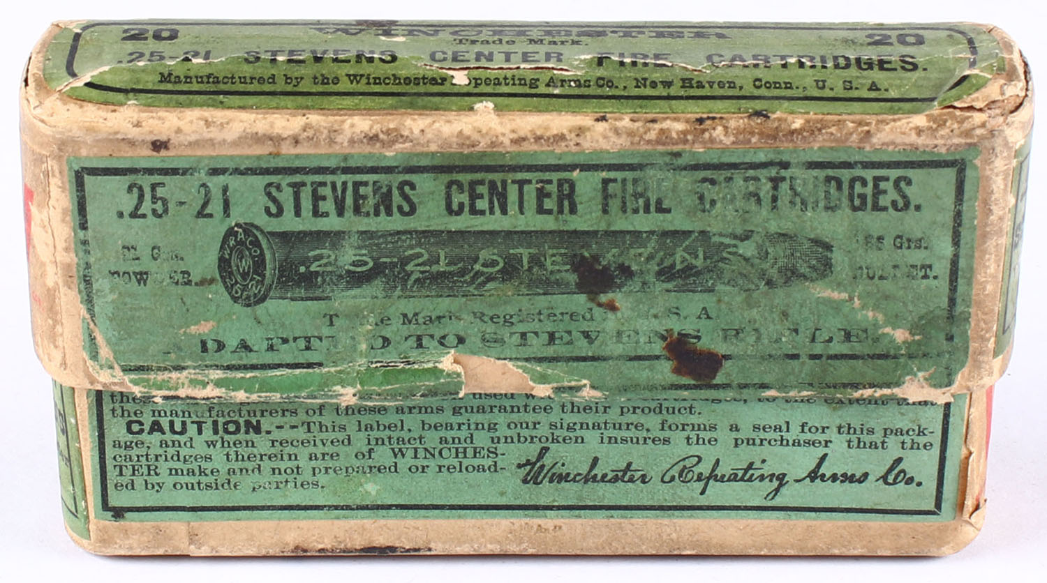 Winchester, .25-21 Stevens Central Fire Cartridges, 86 Grs lead bullet, Empty, 1pc. Buff box with green label, box is solid with very good color, some age soiling & shelf wear, label is solid. Grade: Very Good - Value: 20 to 80