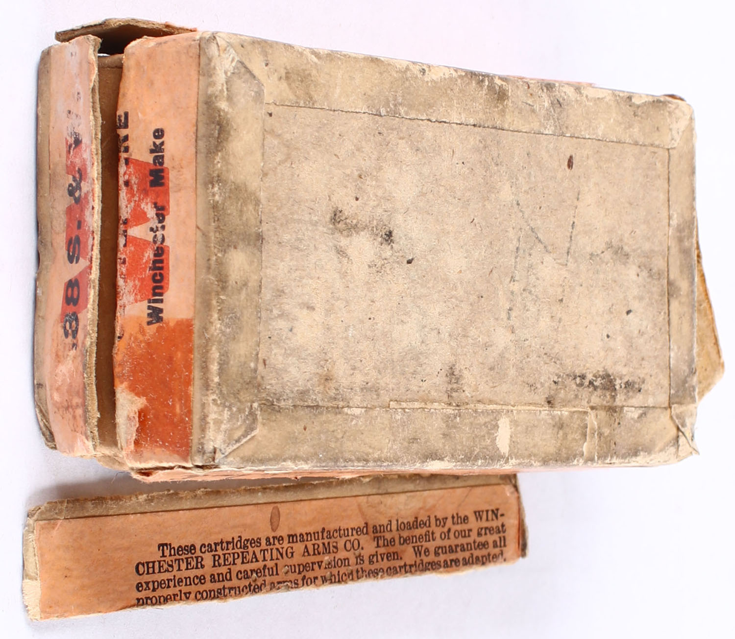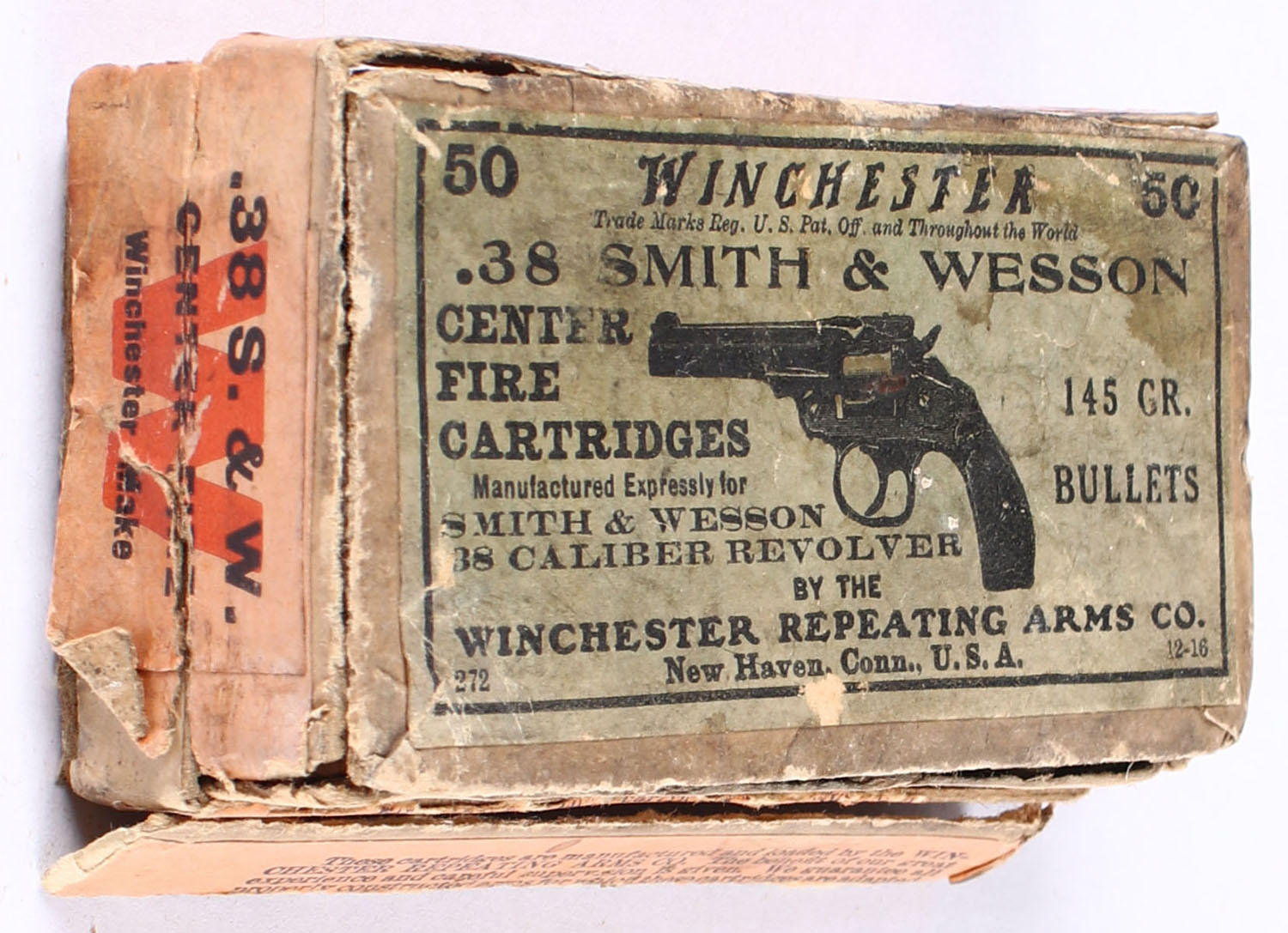 Winchester, .38 Smith & Wesson, Partial 45rds., 2pc. 145 Gr. Bullets, Buff box with green top & orange side sealing labels, box has many seam splits with age soiling, labels are 95% intact, ammo is very good. Grade: Good - Value: 20 to 80