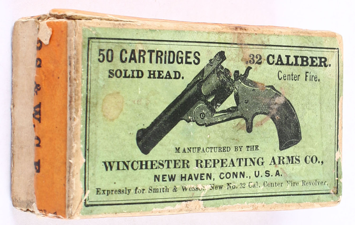 Winchester, Center Fire Cartridges, .32 Smith & Wesson, Solid Head, Full, 2pc. Buff box with green top & orange side sealing labels, box is solid with very good color, some staining on top, vertical seam splits to both left end corners of lid, some edge & corner wear, side sealing label is 75% intact, ammo is excellent. Grade: Very Good - Value: 20 to 60