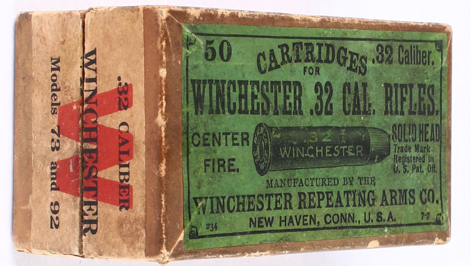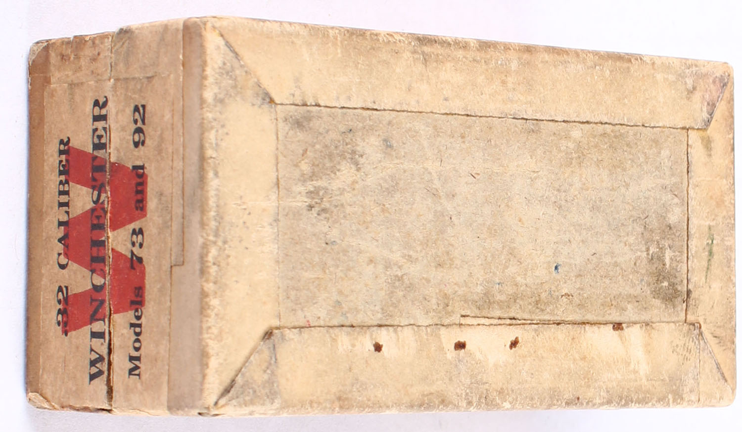 Winchester, .Center Fire, .32 Winchester Center Fire, Solid Head, Partial 47rds., 2pc. Buff box with green top & white side sealing labels, box is solid with good to very good color, age soiling, vertical seam split to front left corner of lid, some edge & corner wear, labels are intact, ammo is good. Grade: Very Good - Value: 40 to 200