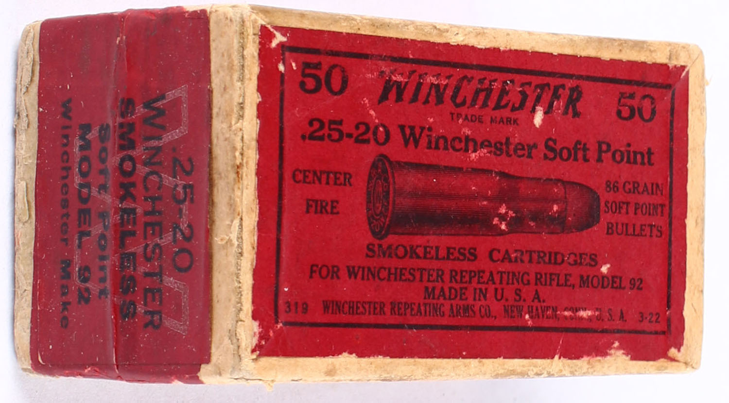 Winchester, Smokeless Cartridges, .25-20 Winchester, 86 Grain Winchester Soft Point, FULL & SEALED, 2pc. Buff box with red top & side sealing labels, box is solid with excellent color, minor shelf wear, some edge & corner wear, labels are intact. Grade: Excellent - Value: 200 to 400