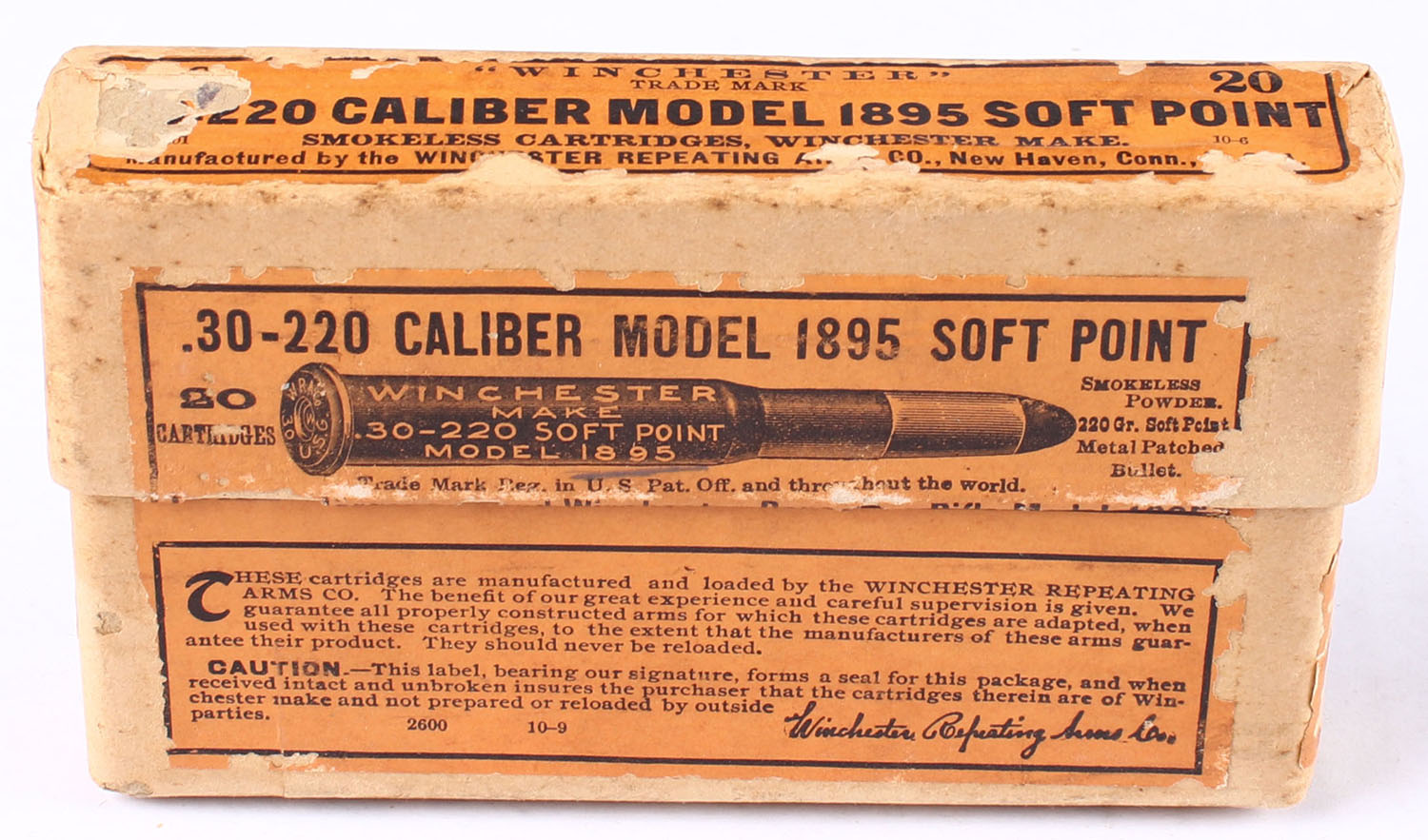 Winchester, Smokeless Cartridges, .30-220, Smokeless, 220 Gr. Soft Point Metal Patched Bullet, Full, 2pc. Buff box with orange labels, box is solid with excellent color, some shelf wear, chipping to top label, minor corner wear, very minor edge wear, labels are 99% intact, ammo is excellent. Grade: Very Good ++ - Value: 30 to 90