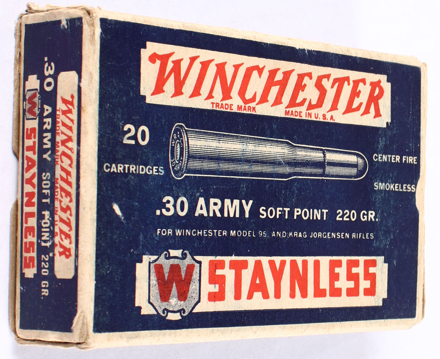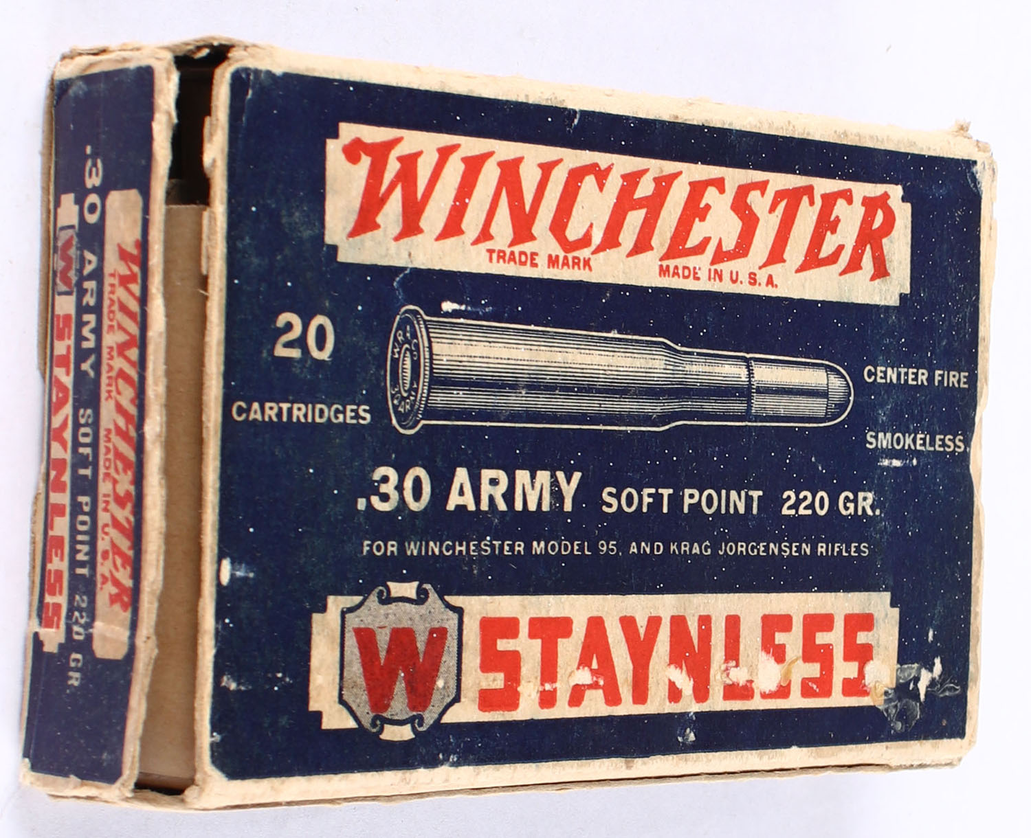 Winchester, Staynless, .30 Army, 220 Gr. Soft Point, Partial 18rds., 1pc. Blue white & red box, box is nice with one end flap torn off, nice color, edges are mostly crisp, end, ammo is excellent. Grade: Very Good ++ - Value: 20 to 30