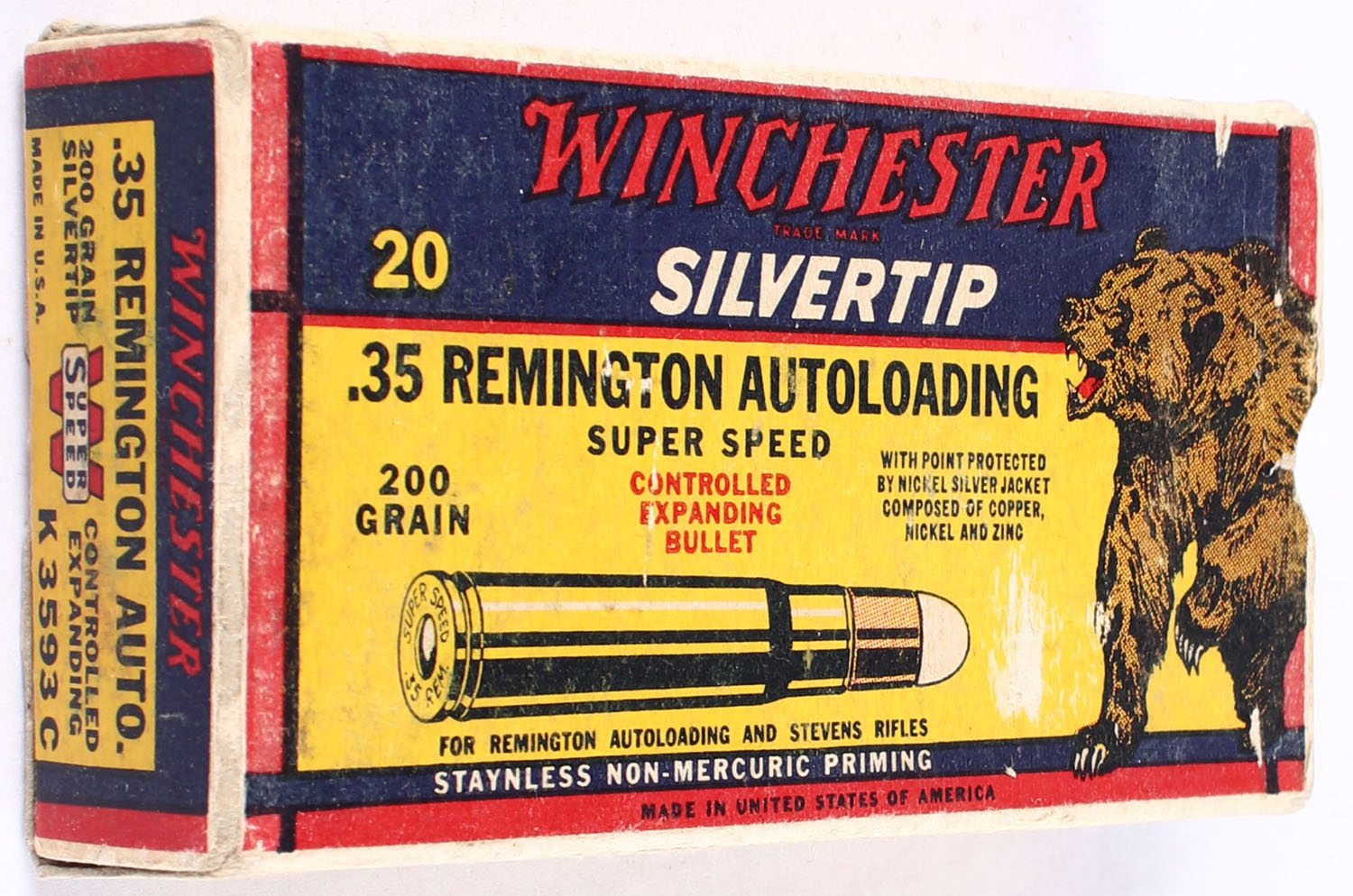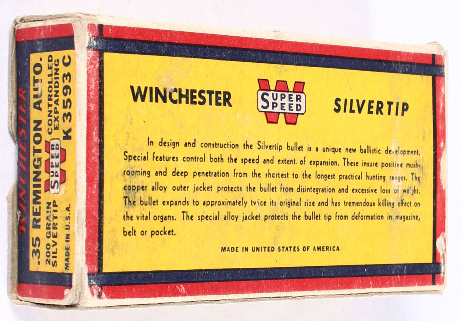 Winchester, Silvertip, .35 Remington Autoloading, 200 Grain Controlled Expanding Bullet, Full, 1pc. Yellow blue & red bear box, box is solid with nice colors, some light scuffing, ammo is excellent. Grade: Excellent - Value: 100 to 200