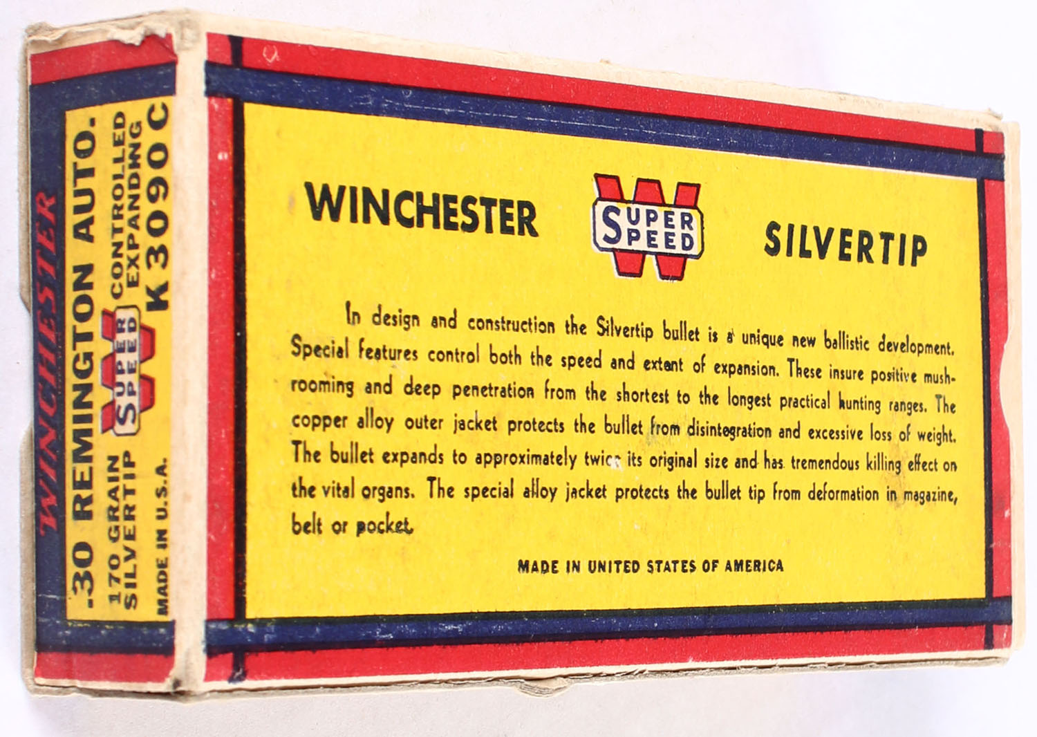 Winchester, Silvertip, .32 Remington Autoloading, 170 Grain Controlled Expanding Bullet, Full, 1pc., yellow blue & red bear box, box is solid with excellent color, end flaps are solid, ammo is excellent. Grade: Excellent - Value: 100 to 300