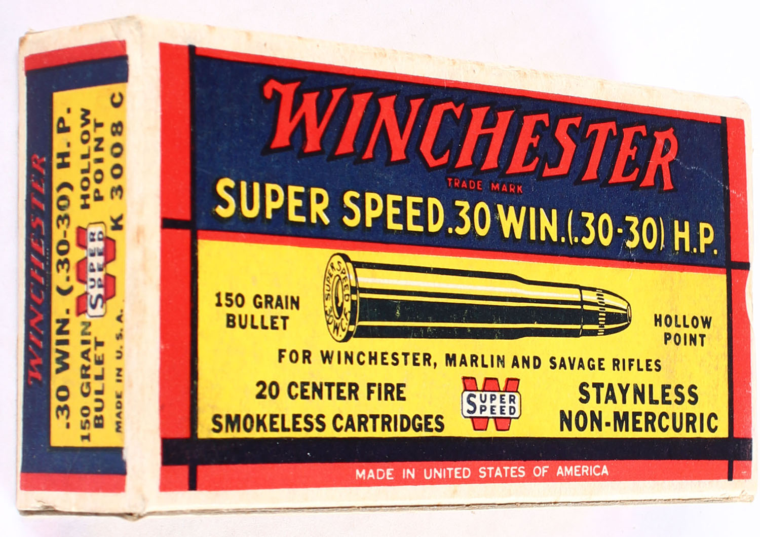 Winchester, Super Speed, .30 Winchester (.30-30), 150 Grain Hollow Point, Full, 1pc. Yellow blue & red box, box is solid with excellent color, very minor shelf & corner wear, edges are mostly crisp, end flaps are solid, ammo is excellent to minty. Grade: Excellent ++ - Value: 50 to 150