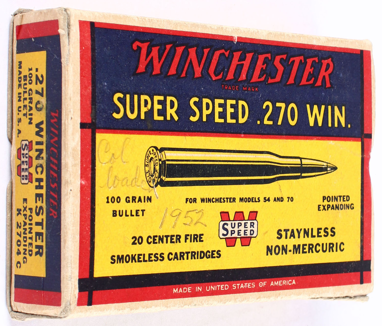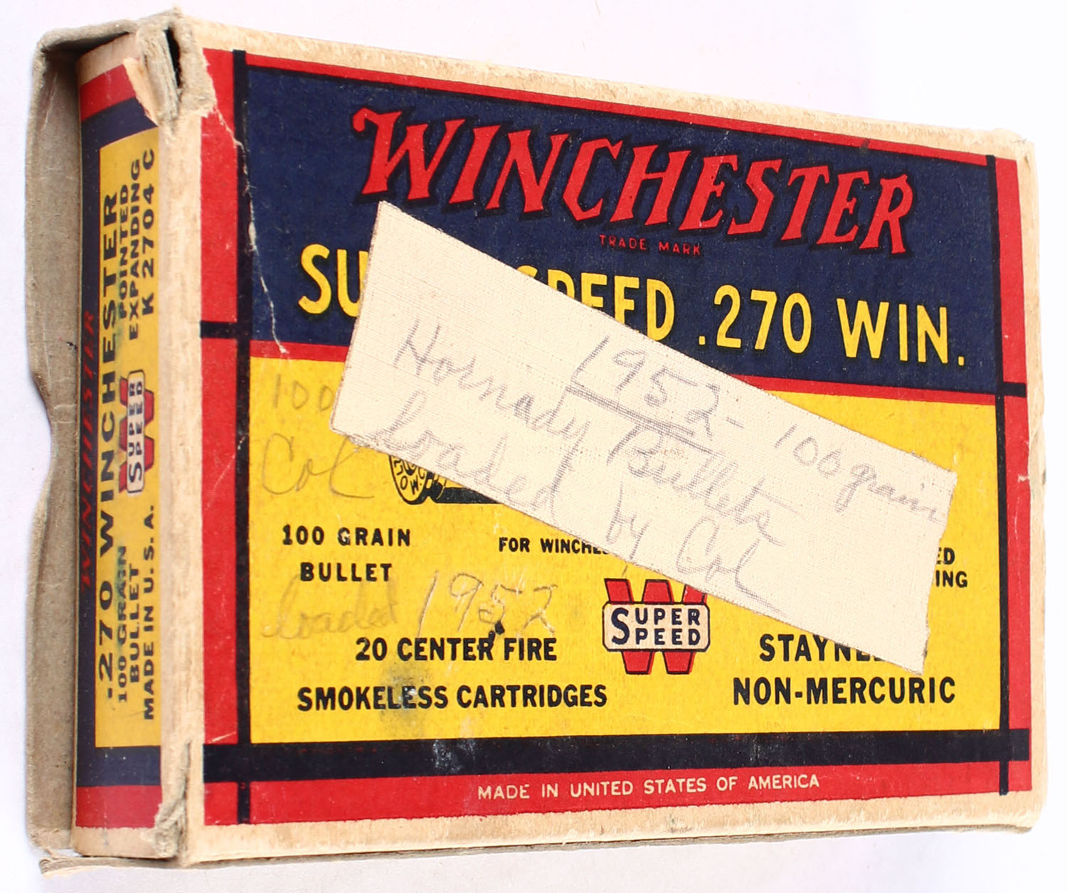 Winchester, Super Speed, .270 Winchester, 100 Grain Pointed Expanding Bullet, Full of reloaded ammunition, 1pc. Yellow blue & red box, box is solid with very good color, some age soiling top has been written on, tape on bottom, partial seam split to top front edge, some corner wear, minor edge wear, end flaps are solid, ammo is very good. Grade: Very Good - Value: 4 to 20