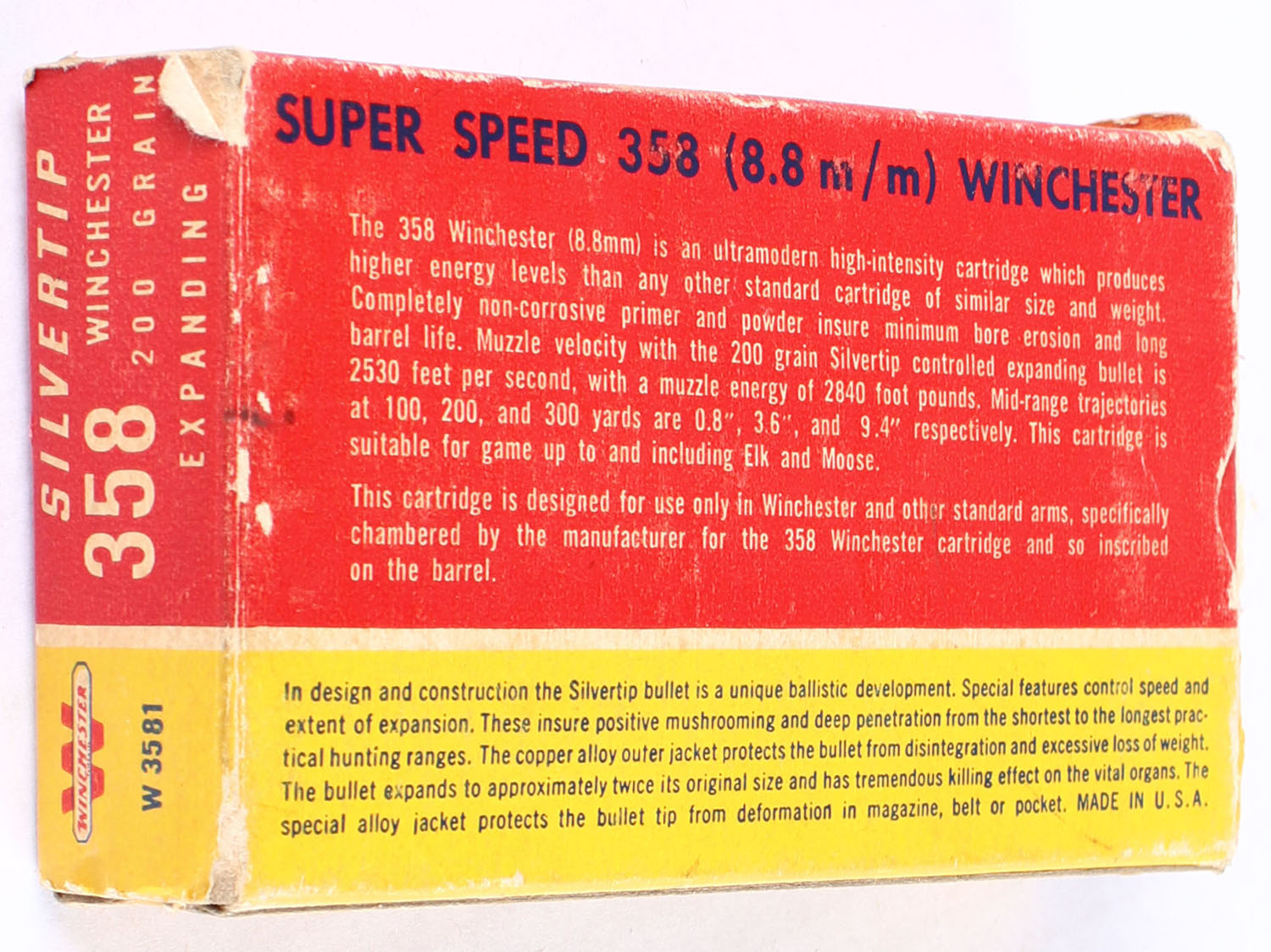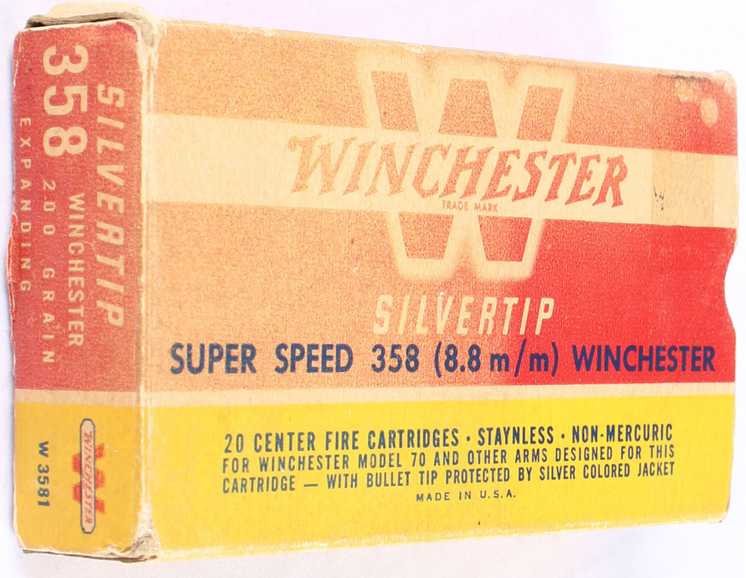 Winchester, Silvertip, .358 Winchester (8.8mm), 200 Grain Controlled Expanding, Full, 1pc. Red yellow & white box, box has age soiling, some edge & corner wear, end flaps are solid, ammo is excellent. Grade: Good ++ - Value: 30 to 45