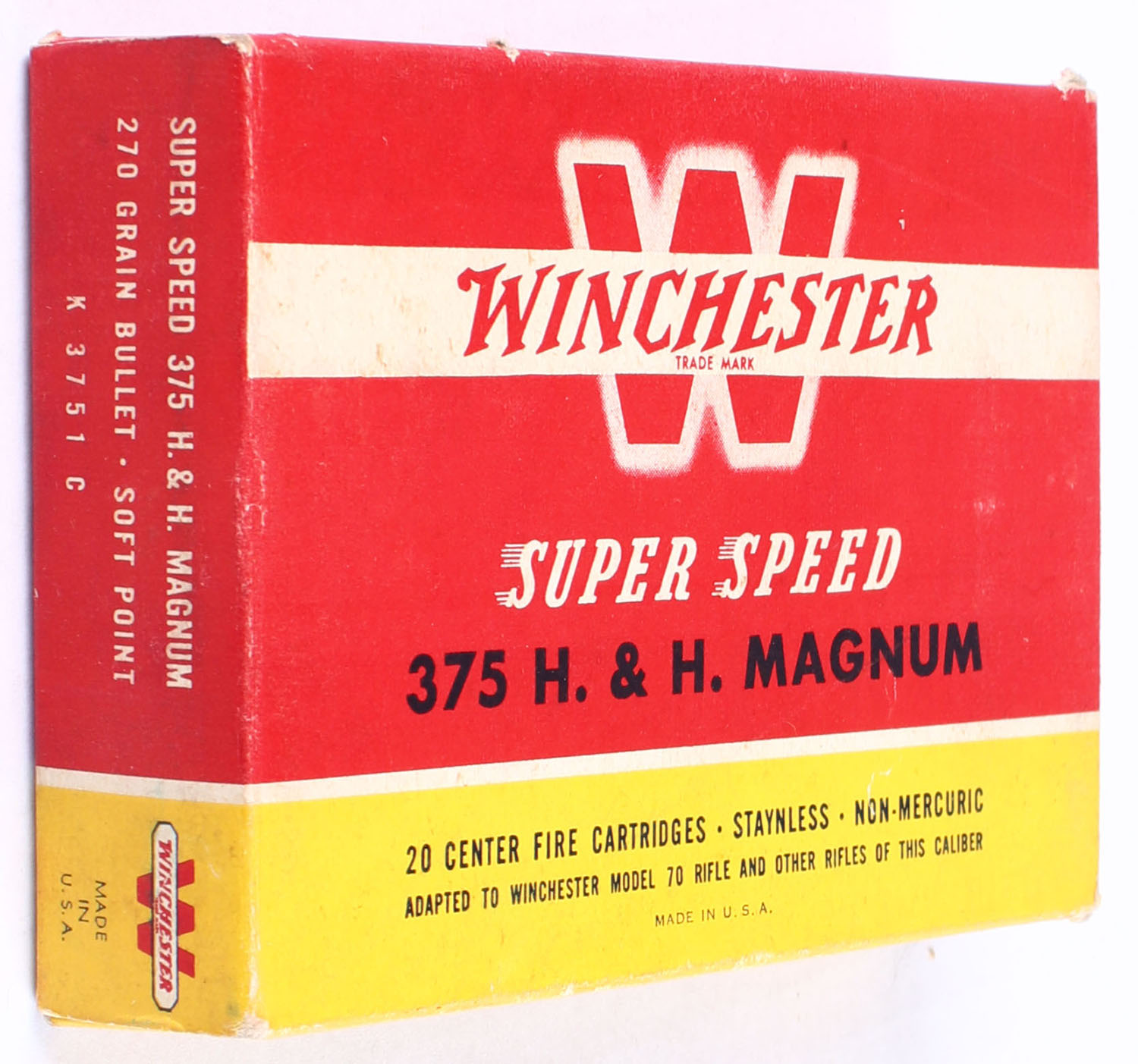 Winchester, Super Speed, 375 H. H. Magnum, 270 Grain Soft Point, Full, 1pc. Red yellow & white box, box is very solid with excellent color, has vey minor edge wear, end flaps are solid, ammo is excellent. Grade: Excellent + - Value: 40 to 60