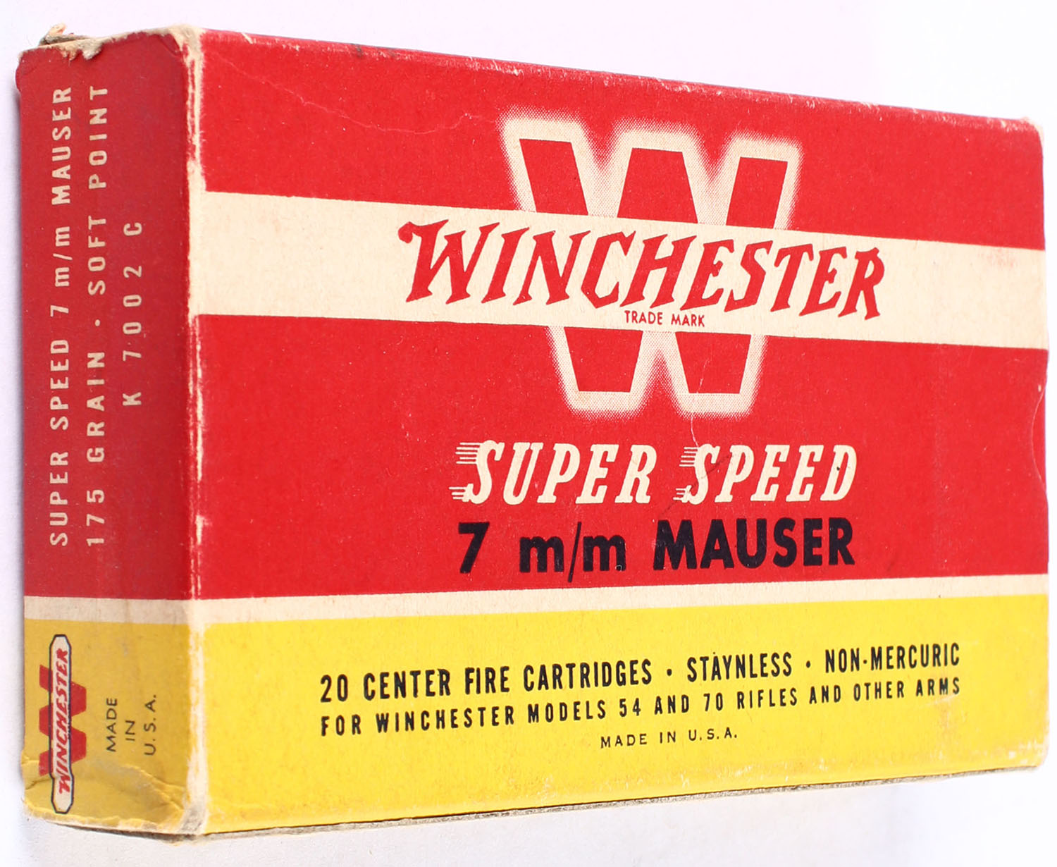 Winchester, Super Speed, 7mm Mauser, 175 Grain Soft Point, Full, 1pc. Red yellow & white box, box is solid with very good color, minor shelf wear, some corner wear, end flaps are solid, ammo is excellent. Grade: Very Good - Value: 20 to 30