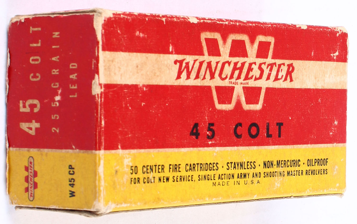 Winchester, Center Fire Cartridges, .45 Colt, 255 Grain Lead Bullet, Full, 1pc. Red yellow & white box, box has some age soiling & edge wear with corner wear, ammo is excellent. Grade: Very Good - Value: 40 to 60