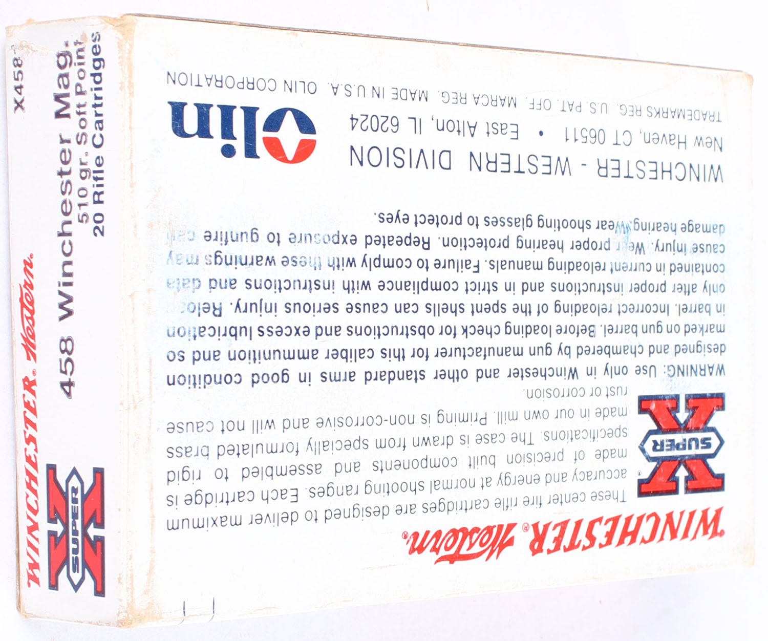 Winchester-Western, Super X, .458 Winchester Magnum, 510 Grain Soft Point, Full, 1pc, White red & black box, box has shelf wear with scuffing, end flaps are solid, ammo is excellent. Grade: Very Good - Value: 60 to 90