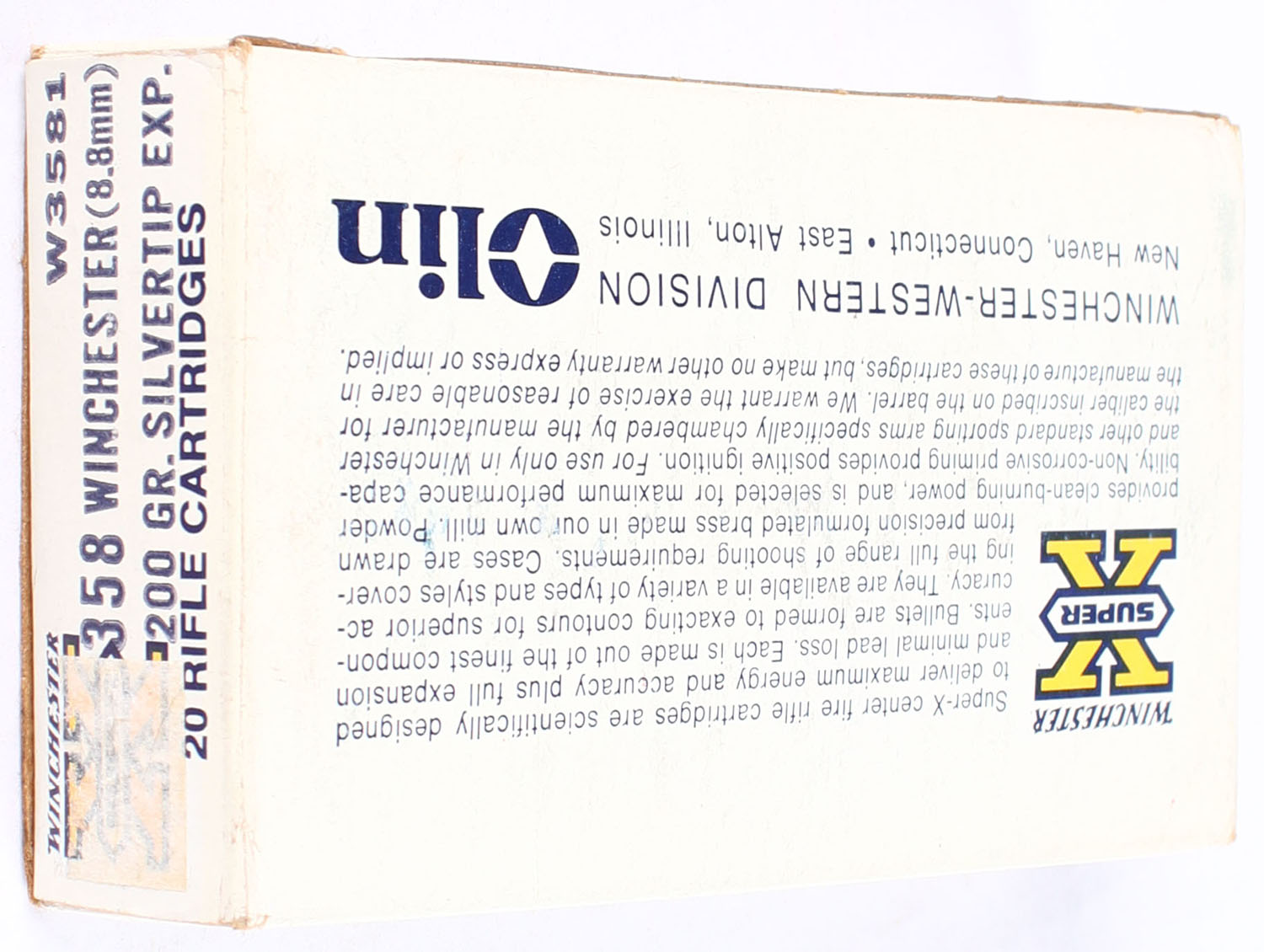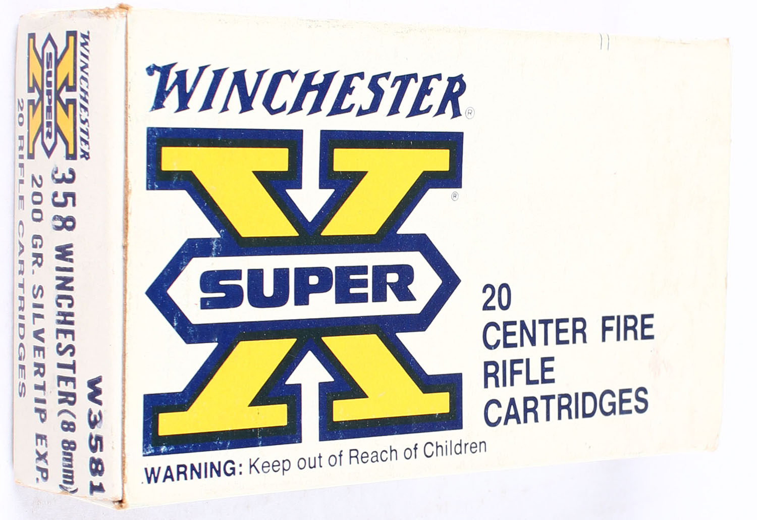 Winchester, Super X, .358 Winchester (8.8mm), 200 Grain Silvertip Expanding, Full, 1pc. White black & yellow box, box is solid with very good to excellent color, minor age soiling, sticker residue on side, minor corner wear, very minor edge wear, end flaps are solid, ammo is very good to excellent. Grade: Very Good ++ - Value: 50 to 75