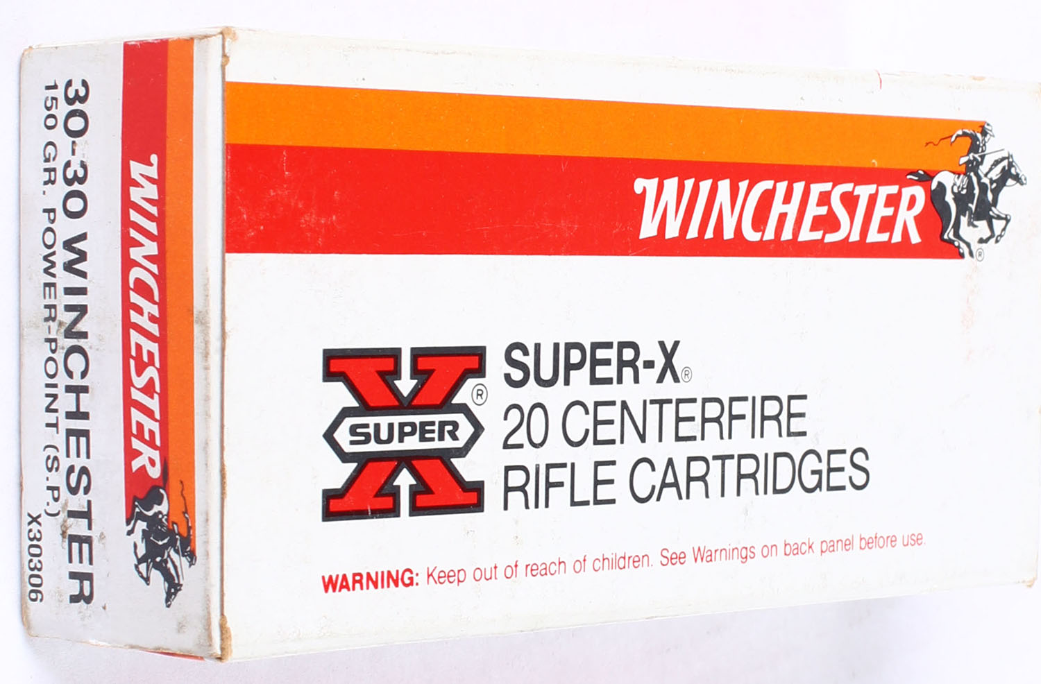 Winchester, Super-X, .30-30 Winchester, 150 Grain Power-Point SP, Full, 1pc. Grey red & orange box, box is solid with excellent color, very minor scuffing, end flaps are solid, ammo is excellent. Grade: Very Good ++ - Value: 20 to 30