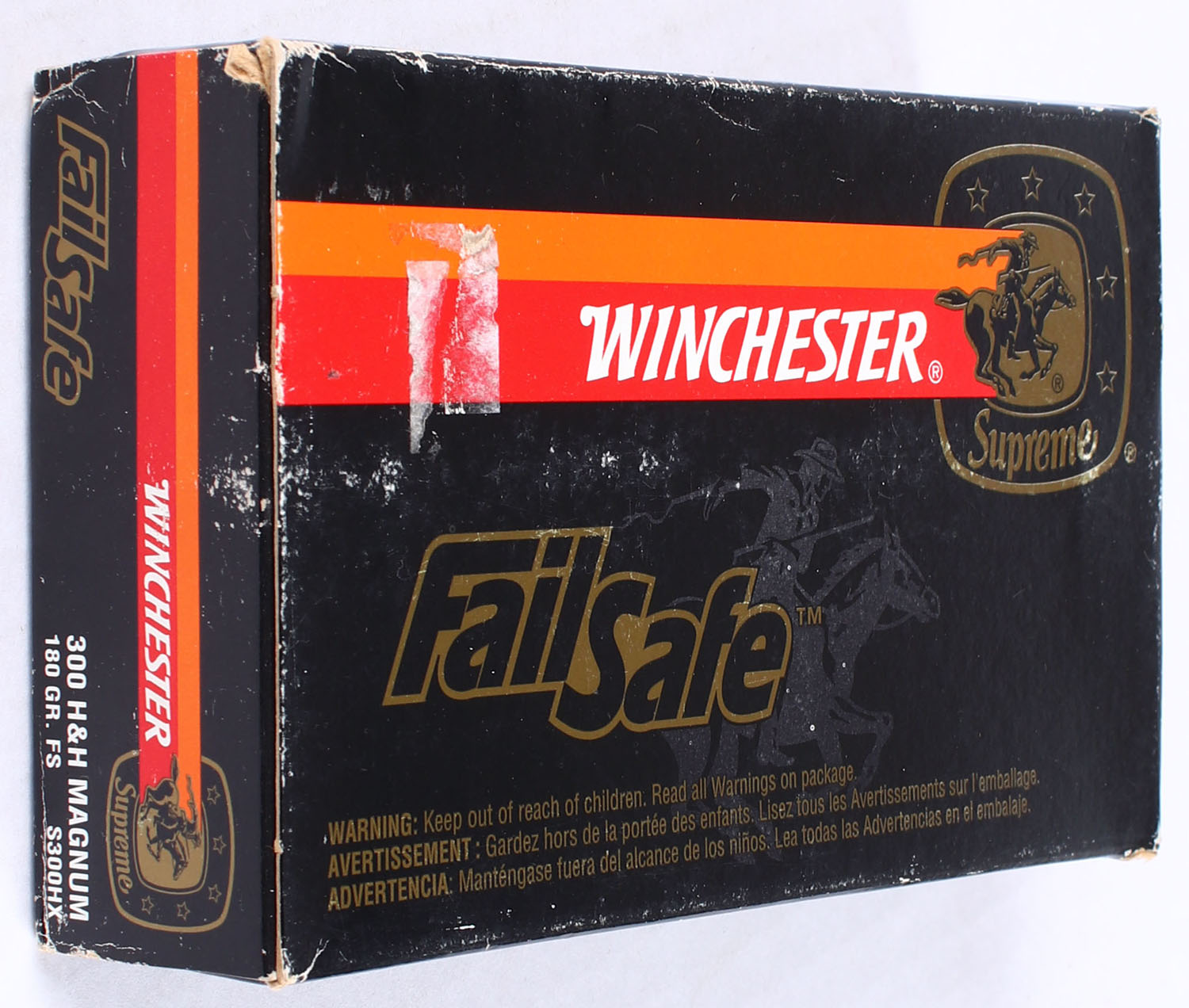 Winchester, Supreme FailSafe, 300 H & H Magnum, 180 Grain F.S., Black box with gold, white, orange & red print, box has rub marks with edge & corner wear, has sticker residue on front, end flaps are sold, ammo is excellent. Grade: Very Good ++ - Value: 24 to 36
