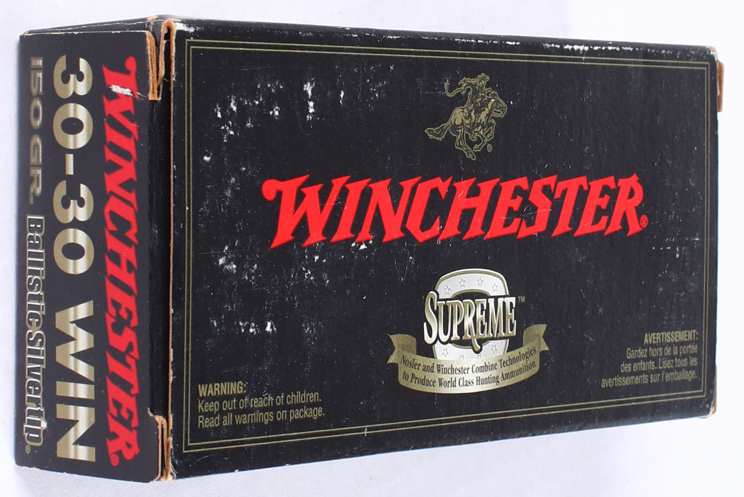 Winchester, Supreme, .30-30 WIN., 150 Grain Ballistic Silvertip, Full, 1pc., Black & red box, box is solid with scuffing, very minor corner wear, end flaps are solid, ammo is excellent. Grade: Very Good ++ - Value: 24 to 36