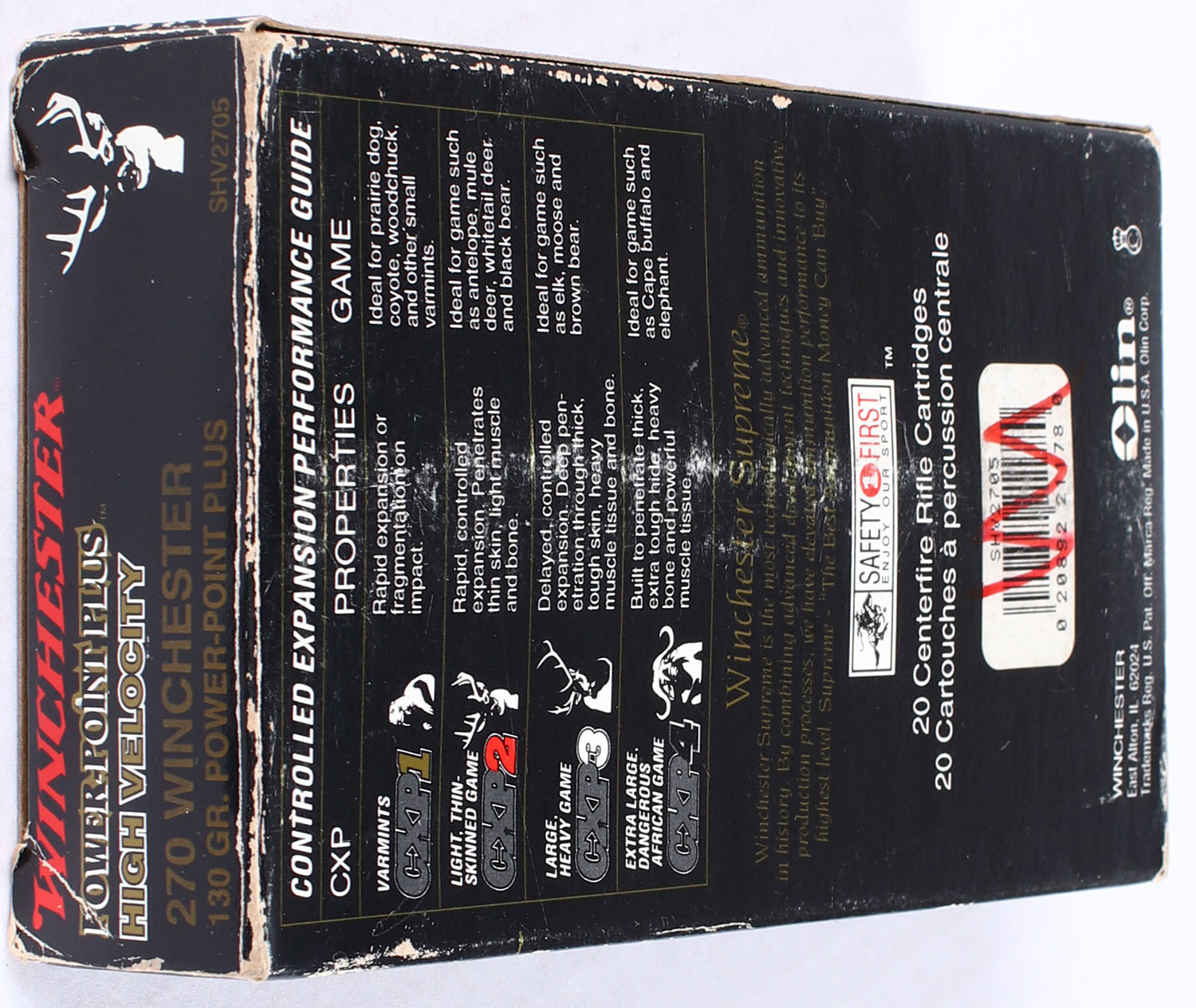Winchester, Supreme, .270 Winchester, 130 Grain Power-Point Plus, Full, 1pc. Black & red box, box has edge & corner wear with rub marks, end flaps are solid, ammo is good. Grade: Very Good - Value: 24 to 36