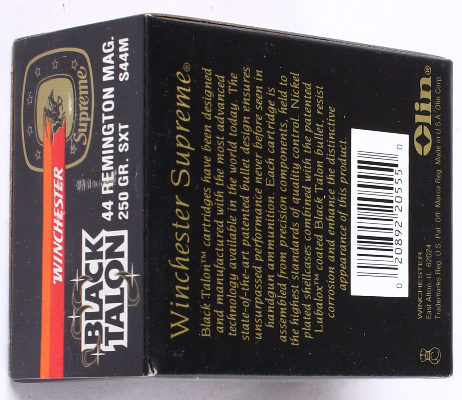 Winchester, Black Talon, .44 Remington Magnum, 250 Gr. SXT, Full, 1pc. Black red & orange box, box is MINT with minty color, corners are sharp, edges are crisp, end flaps are solid, ammo is minty. Grade: MINT - Value: 60 to 90