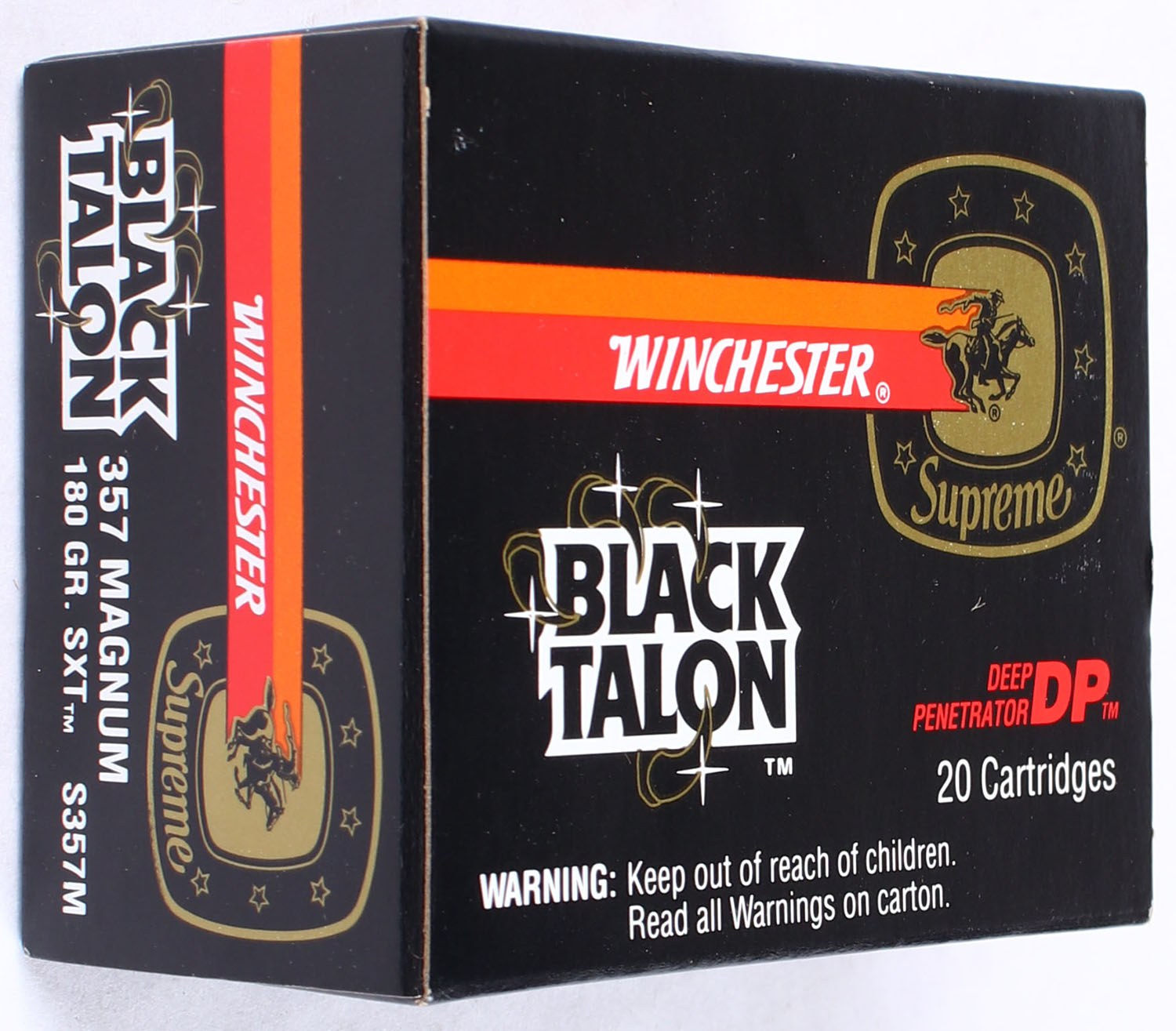 Winchester, Black Talon, .357 Magnum, 180 Gr. SXT, Full, 1pc. Black red & orange box, box is solid with excellent to minty color, minor shelf & corner wear, edges are crisp, end flaps are solid, ammo is minty. Grade: MINT - Value: 90 to 120