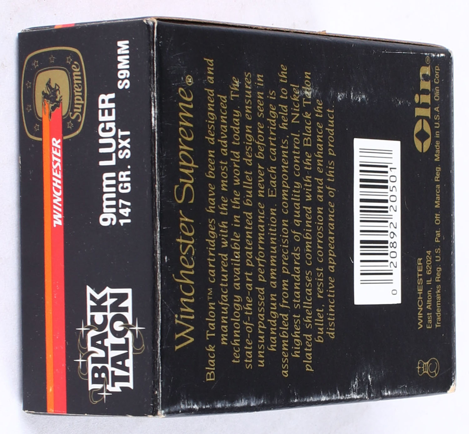 Winchester, Black Talon, 9mm Luger, 147 Gr. SXT, Full, 1pc. Black red & orange box, box is solid with excellent color, very minor corner wear, edges are crisp, end flaps are solid, ammo is minty. Grade: Excellent + - Value: 50 to 75
