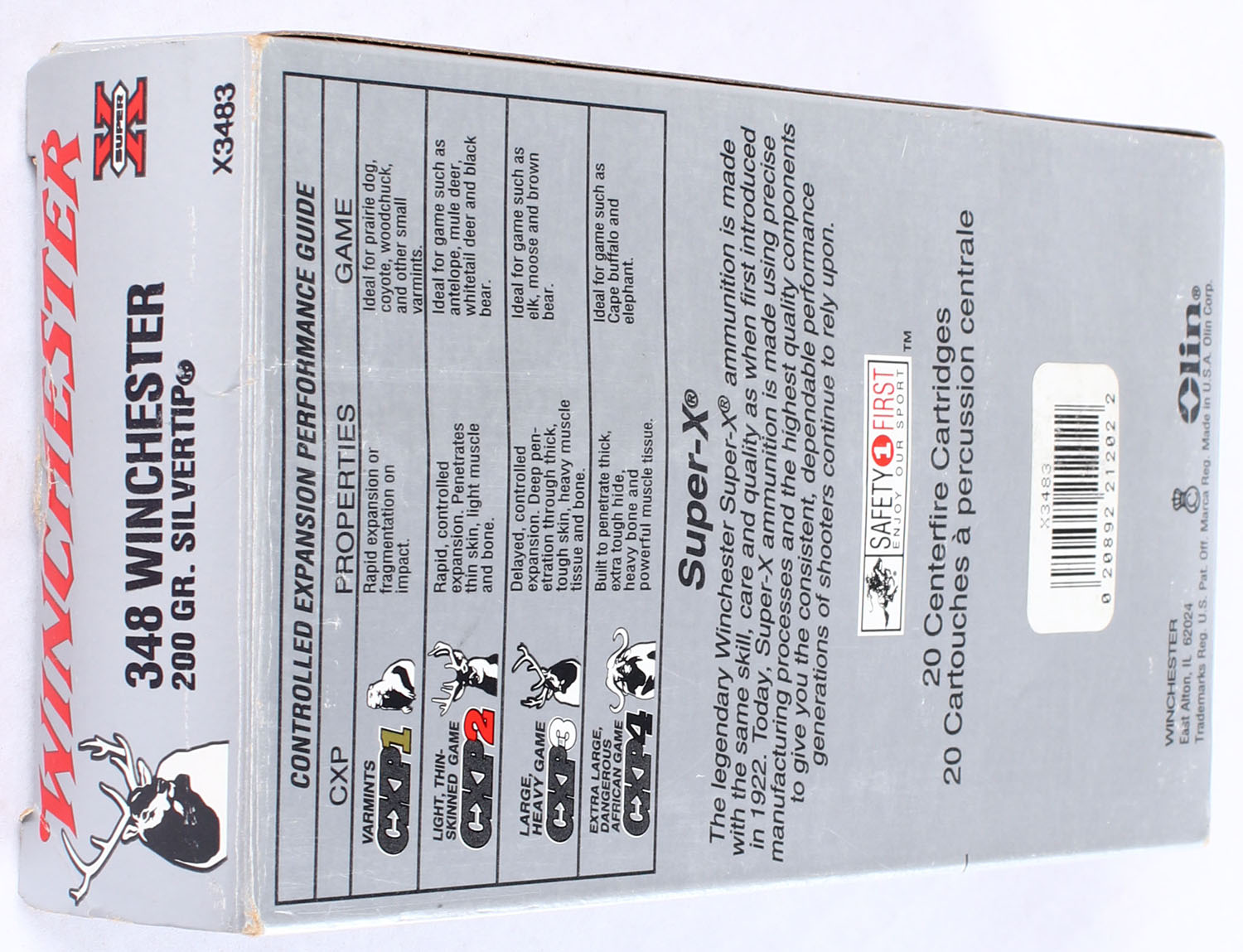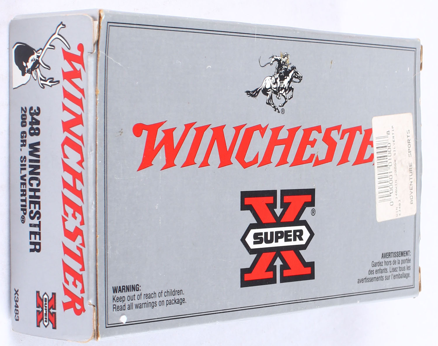 Winchester, Super X, .348 Winchester, 200 Grain Silvertip, Full, 1pc., Silver & red box, box is solid with some scuffing & light corner wear, has sticker to top, end flaps are solid, ammo is very good. Grade: Very Good - Value: 50 to 75