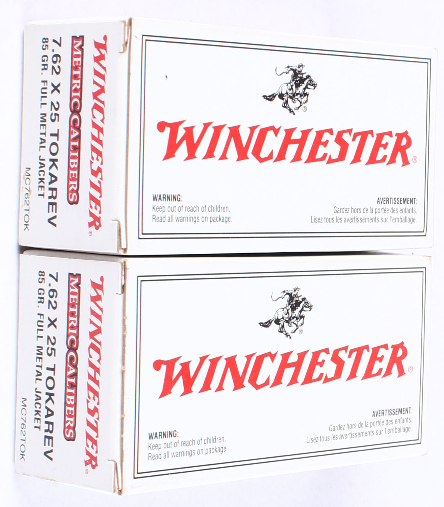 Winchester, Lot of (2), Metric Calibers, 7.62 x 25 Tokarev, 85 Grain FMJ, Full, 1pc. White & red boxes, boxes are very solid with excellent color, ammo is is mint. Grade: MINT - Value: 20 to 30
