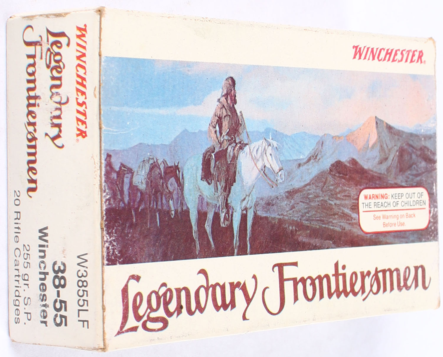 Winchester, Legendary Frontiersmen, .38-55 Winchester, 255 Grain Soft Point, Full, 1pc. Multi-colored box, box is solid with very good to excellent color, minor corner wear, edges are mostly crisp, end flaps are solid, ammo is minty. Grade: Excellent - Value: 80 to 120