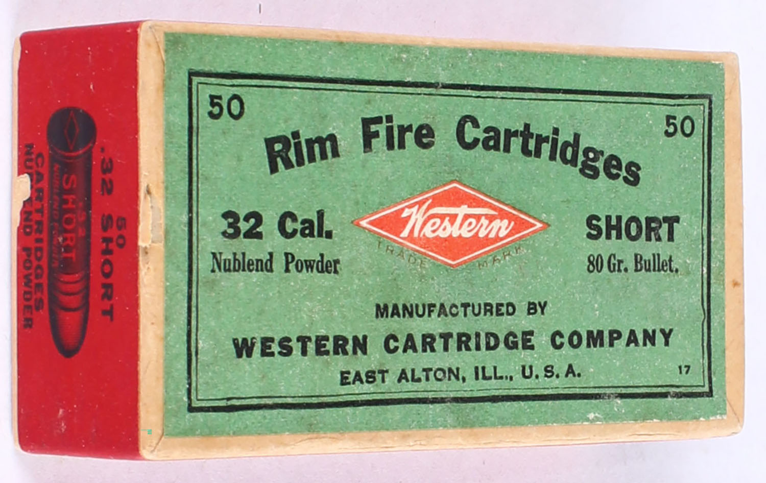 Western, Rim Fire Cartridges, .32 Short, Nublend Powder, 80 Grain Bullet, FULL & SEALED, 2pc. Buff box with green top & red side sealing labels, box is very solid with excellent color, corners are sharp, edges are crisp, labels are intact. Grade: Excellent ++ - Value: 120 to 180