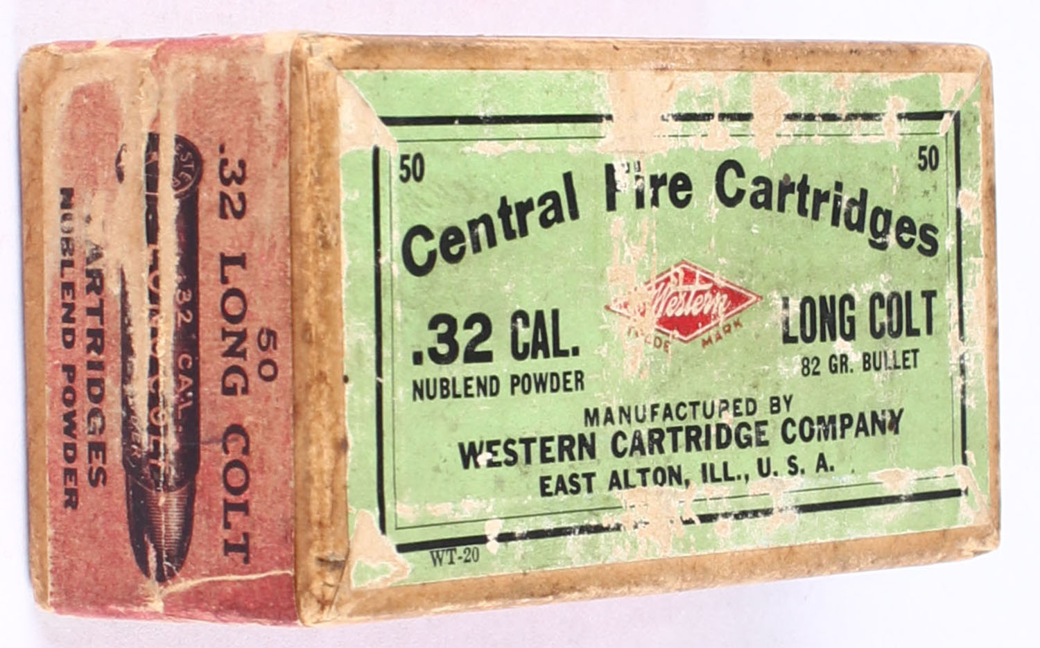 Western, Central Fire Cartridges, .32 Cal. Long Colt, Nublend Powder, 82 Grain Bullet, FULL & SEALED, 2pc., Buff box with green top & red side sealing labels, box has some age soiling with rub marks, corners are sharp, labels are intact. Grade: Excellent - Value: 80 to 120