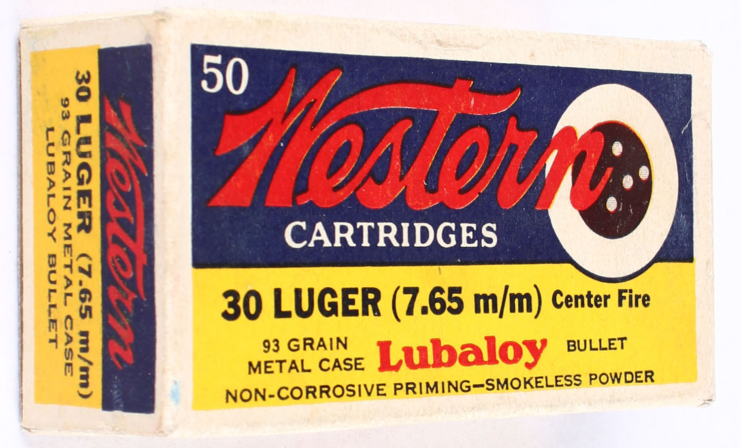 Western, Lubaloy Cartridges, .30 Luger (7.65mm), 93 Grain Metal Case Bullet, Full, 1pc. Blue yellow & red bulls eye box, box is very solid with excellent color, end flaps are solid, ammo is excellent. Grade: Excellent + - Value: 40 to 60