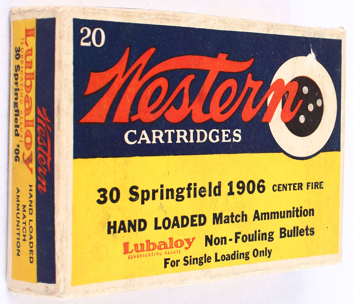 Western, .30 Springfield 1906, Handloaded match ammo., Full, 1Pc., Blue yellow & red bulls eye box, box has some scuffing & minor corner wear, end flaps are solid, ammo is excellent. Grade: Excellent - Value: 34 to 50