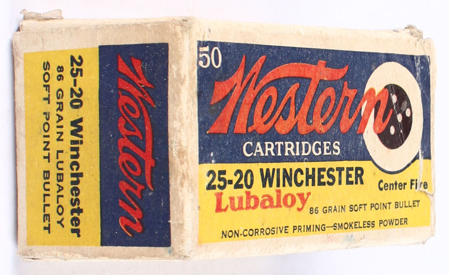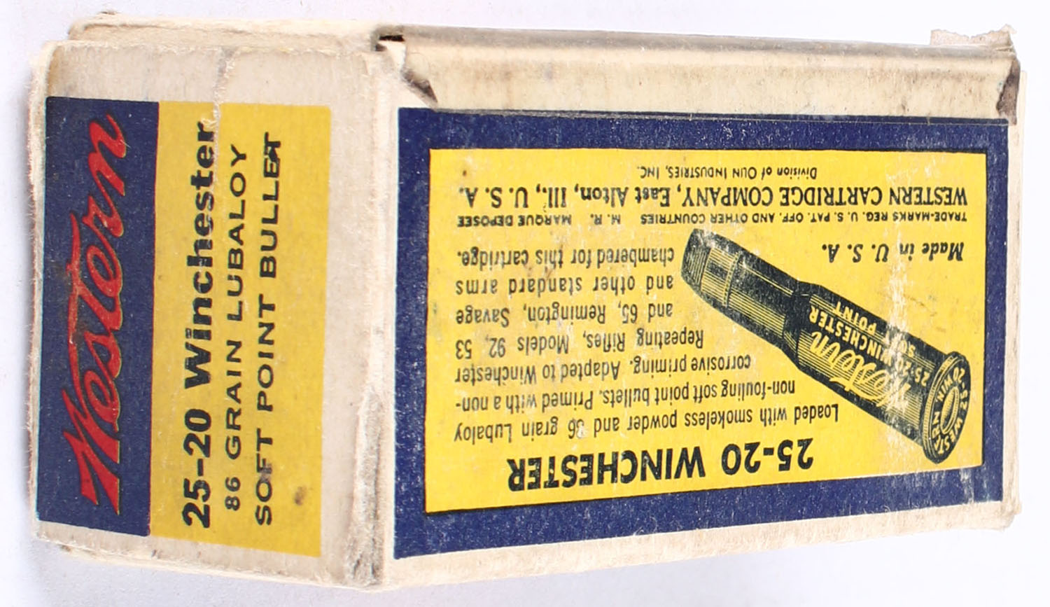 Western, Lubaloy Cartridges, .25-20 Winchester, 86 Grain Soft Point Bullet, Full, 1pc. Yellow blue & red bulls eye box, box has shelf wear with edge & corner wear, has tape repair to seam, end flaps are solid, ammo is excellent. Grade: Very Good + - Value: 80 to 120
