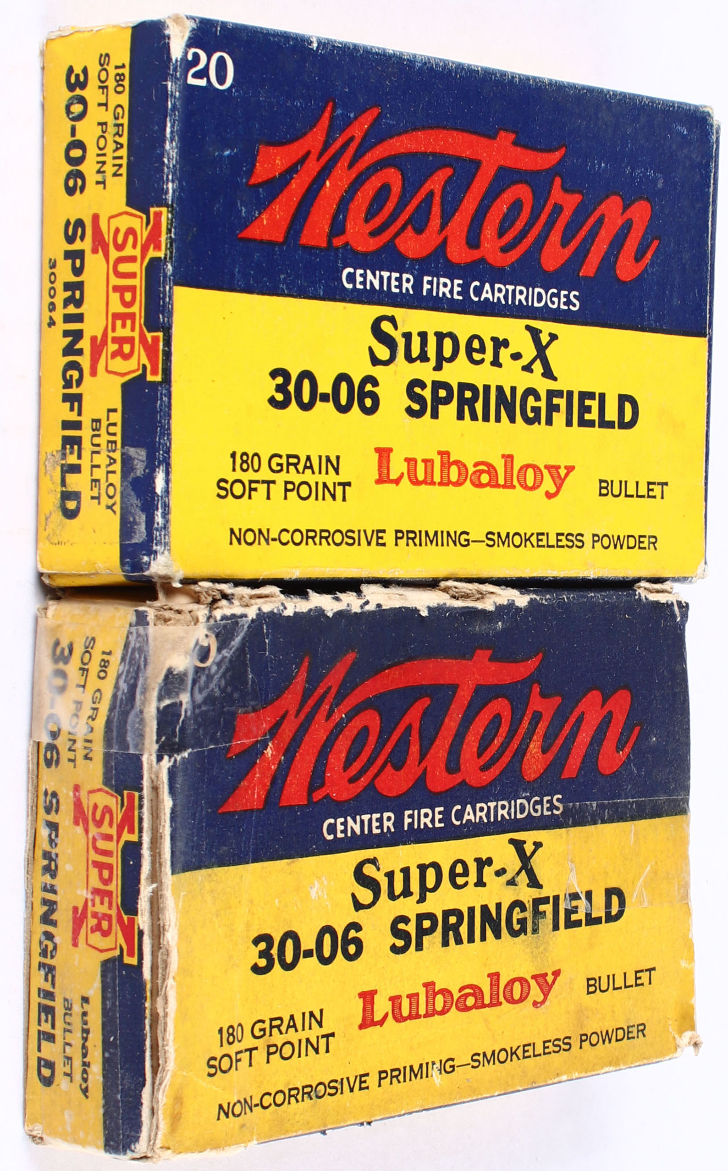 Western, Lot of (2), Super-X, .30-06 Springfield, 180 Grain Soft Point, Full with 30rds. Being correct, 1pc. Yellow blue & red boxes, (1) box very solid, (1) box has edge & corner wear with tape repairs and missing end flap, ammo is very good. Grade: Very Good - Value: 40 to 60