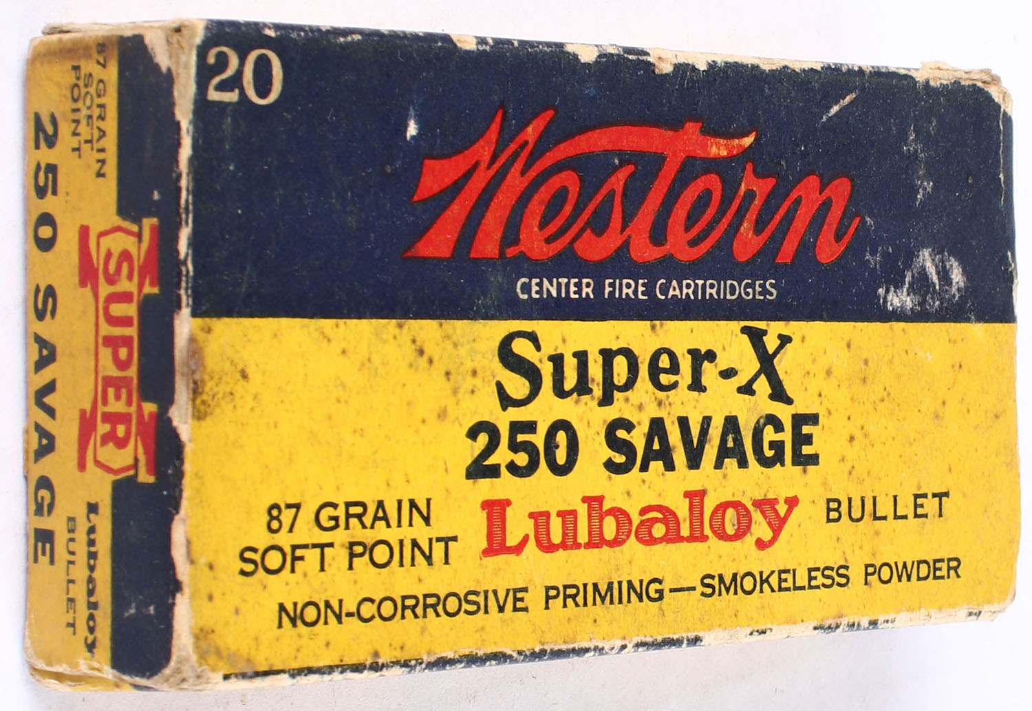 Western, Super-X, .250 Savage, 87 Grain Soft Point Lubaloy Bullet, Full, 1pc. Yellow blue & red box, box has age soiling with edge & corner wear, box is missing right end flap, ammo is very good. Grade: Good + - Value: 40 to 60