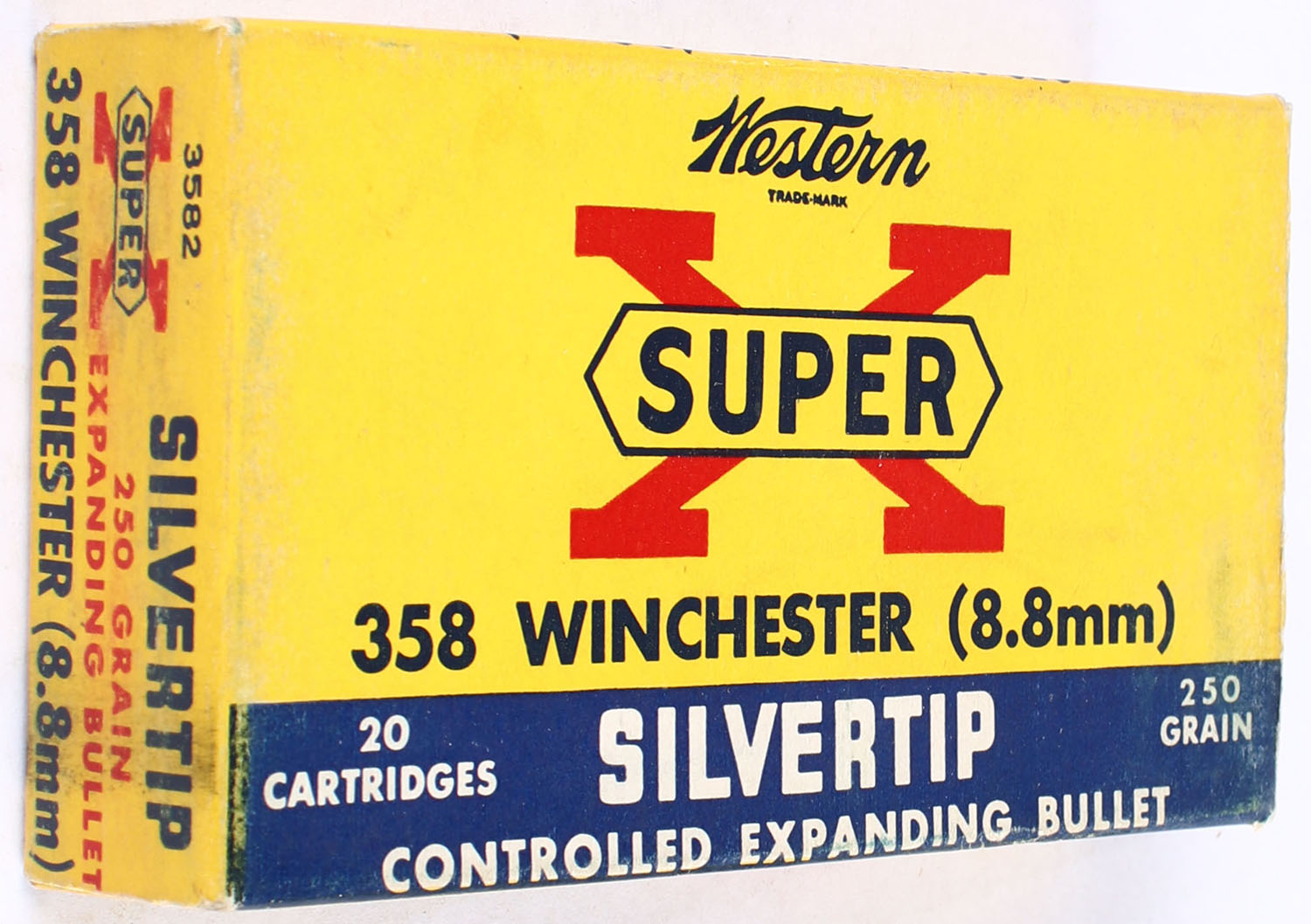 Western, Super X Silvertip, .358 Winchester (8.8mm), 250 Grain Controlled Expanding Bullet, Full, 1pc. Yellow blue & red box, box is very solid with excellent color, end flaps are solid, ammo is excellent. Grade: Excellent + - Value: 60 to 90