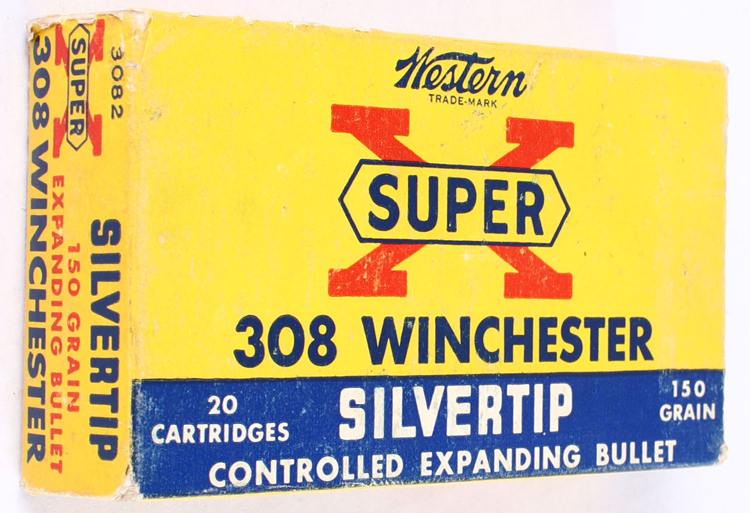 Western, Super X Silvertip, .308 Winchester, 150 Grain Controlled Expanding Bullet, Full, 1pc. Yellow blue & red box, box is solid with excellent color, very minor age soiling, minor corner & edge wear, end flaps are solid, ammo is excellent. Grade: Excellent - Value: 40 to 60